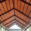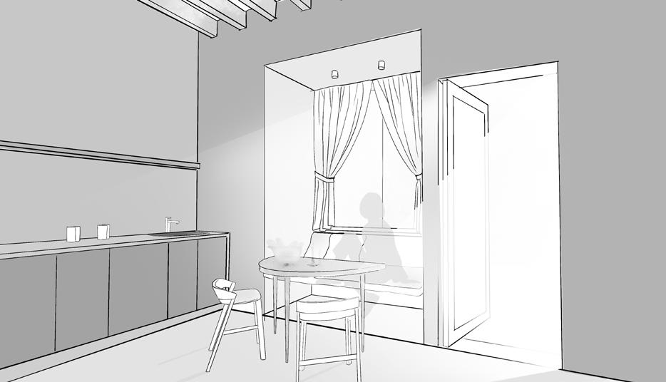 The bay window features elegant wooden rafters, creating a cozy breakfast corner that overlooks the east veranda. This inviting nook fills the space with morning light and is seamlessly integrated with the dry kitchen cabinets, making it the perfect spot for leisurely meals and coffee.