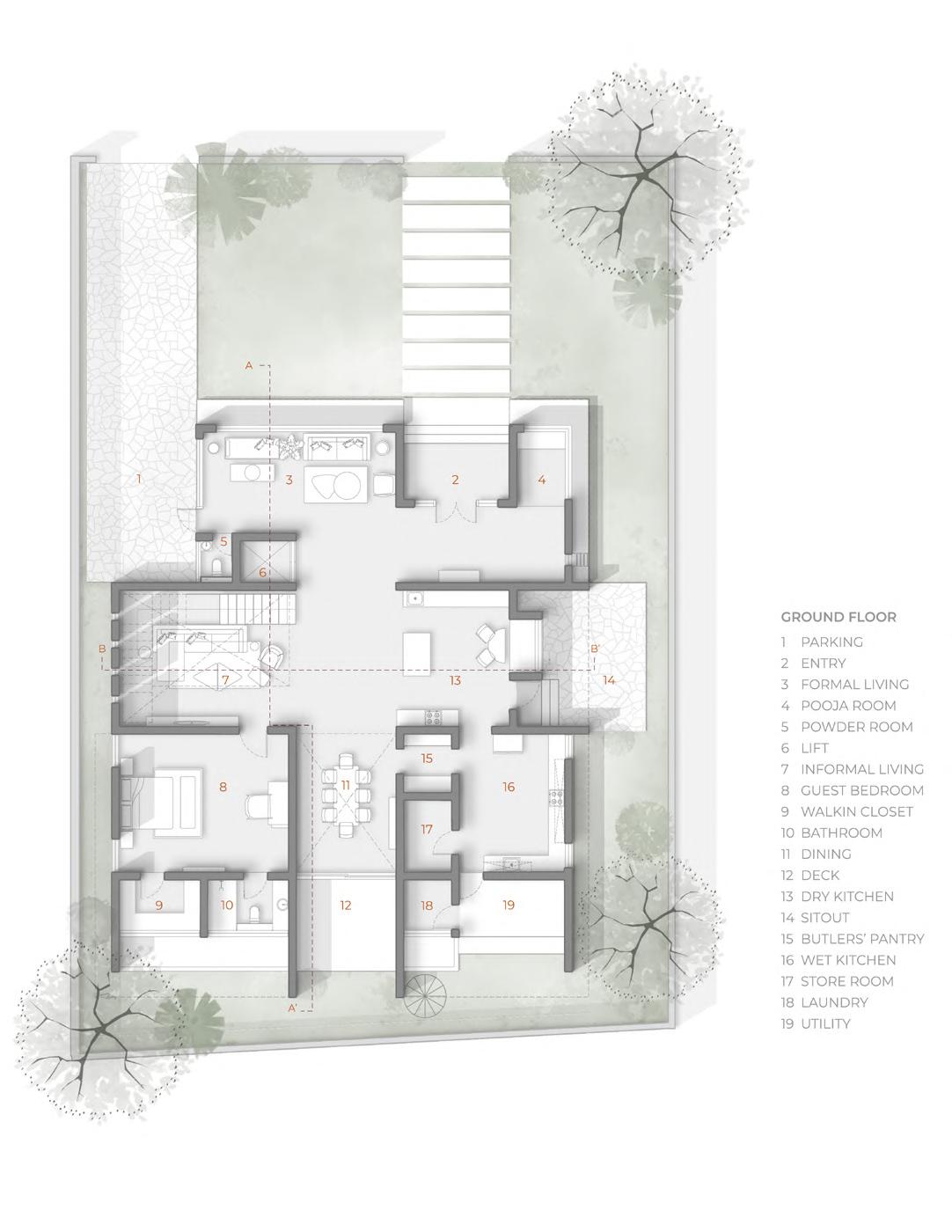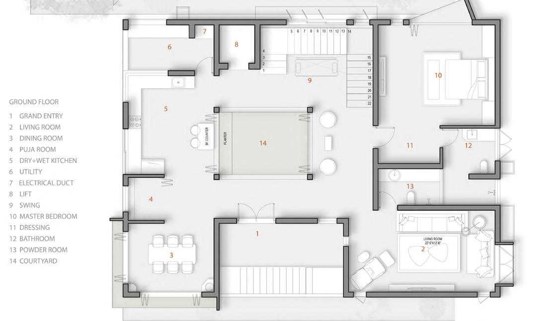 “Boorugu Anganam” seamlessly integrates Vastu principles and climatology. Strategic ventilation, 11’6” ceilings, while stack effect principles regulate temperature, creating a comfortable, eco-friendly living space.