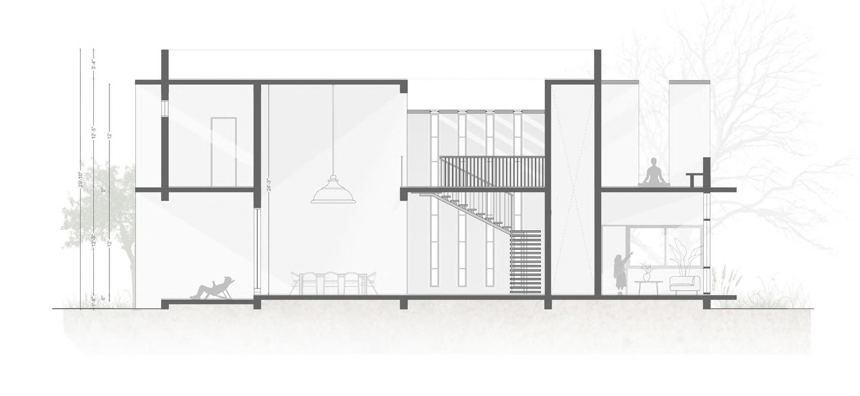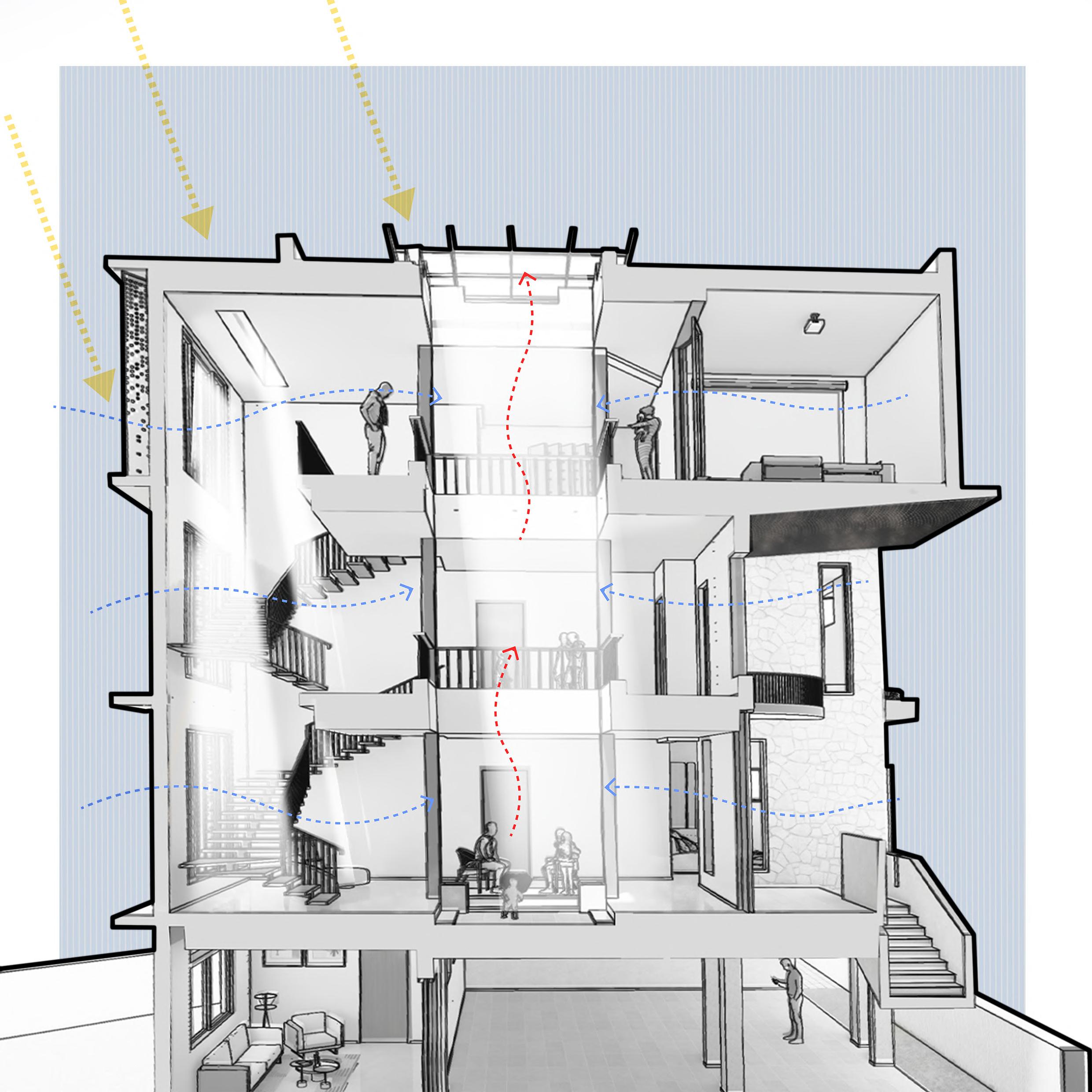 •Triple-height central courtyard utilizing stack effect principles to draw warm air upward and outward.