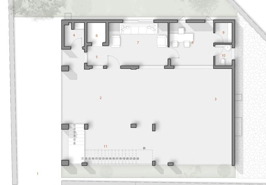 The equestrian centre is reached from the north and can be accessed by car or public transport. The machinery and manure management are centred around the southwestern courtyard and separated from the public flows.