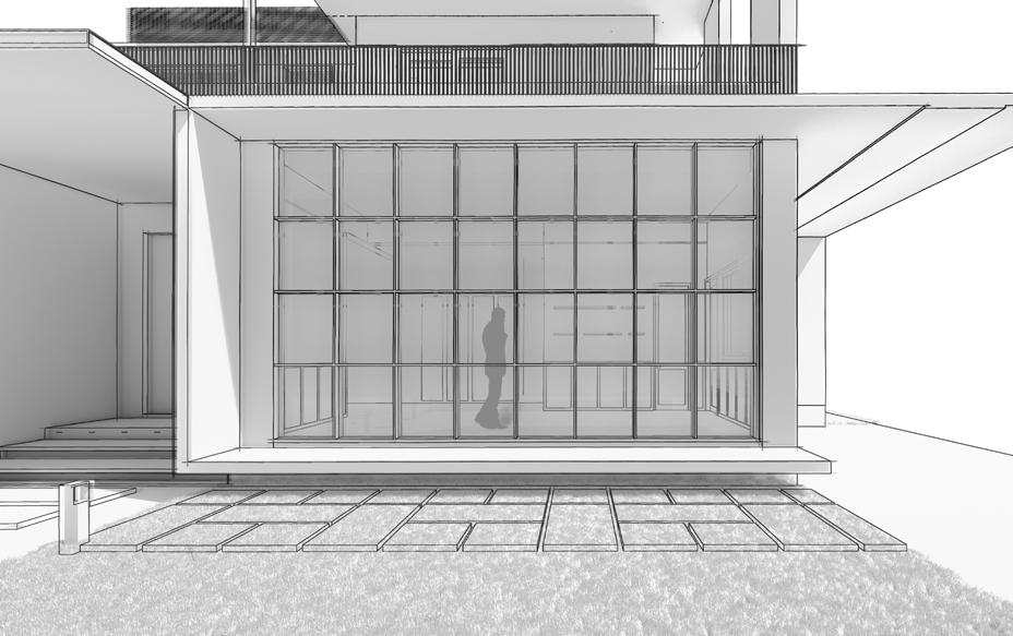 The entrance patio features a grand 10’ x 10’ door framed by a multi-functional 3-foot wide ‘C’ structure. A seamless design with an inverted beam and 10-foot cantilevering slab leads to the 12’ x 21’ grid window, which captures soft northern light. The 12’ x 20’ parking bay completes the space with style and function.
