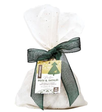 Panettoni golosi arricchiti con ingredienti del commercio equo e confezionati in carta seta con decoro a fiori.