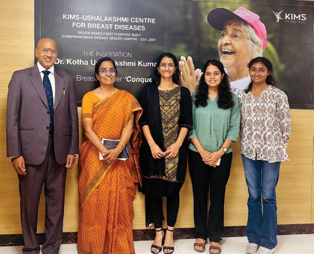 Dr Nina Tamarisa from MD Anderson Cancer Center, Houston and Dr Raghu Ram—recipients of the prestigious Prof Charles Balch Research Fellowship in Breast Surgical Oncology for 2025—alongside Sandhya Kanneganti, Manisha Koppala, and Vedha Penmetcha at the KIMSUSHALAKSHMI Centre for Breast Diseases.