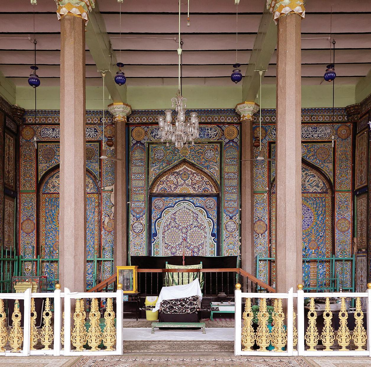 A tapestry of intricate patterns with jewel-like shapes fills the four walls making you lose yourself in their beauty. Typical Indian colours like mustard yellow and brown add vibrancy while the high ceilings give it a stately effect. The mosaic tiles were originally from Iran, and one can see the mark on the walls where the floods of 1908 had left a mark. As the floods damaged the lower parts of the tiled walls, they were painted in the same patterns and colours, as the art of making intricate tiles had disappeared even back then.