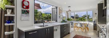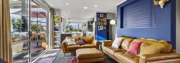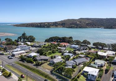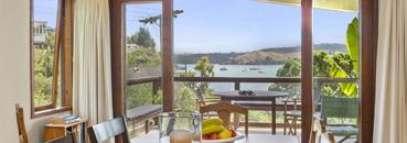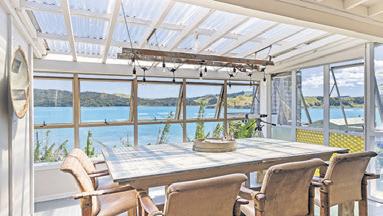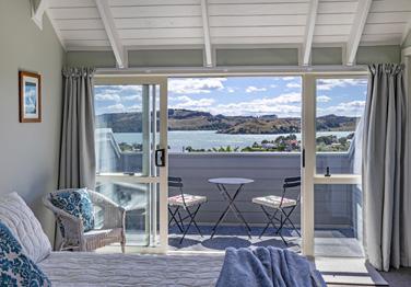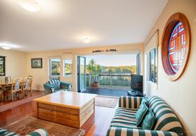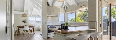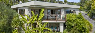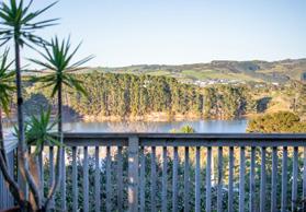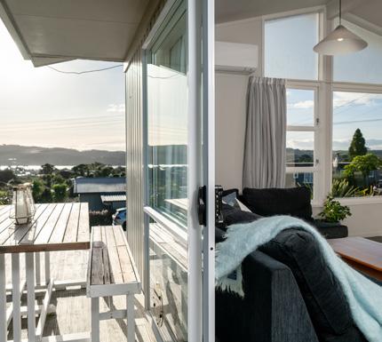 The Lookout - Flax Cove | Sitting in pride of place at the top of Robertson St, with incredible views overlooking Flax cove, the inner harbour and Mt Karioi, this elevated home is sure to capture your heart. The charming board & batten exterior and circular stain glass window, really add to the holiday bach feeling. Set on a generous 827sqm freehold section, in a prime location - this property really has it all! The lower level welcomes you into a lovely open plan living area that flows out onto the front deck.