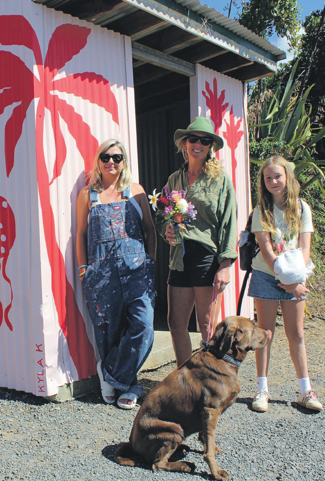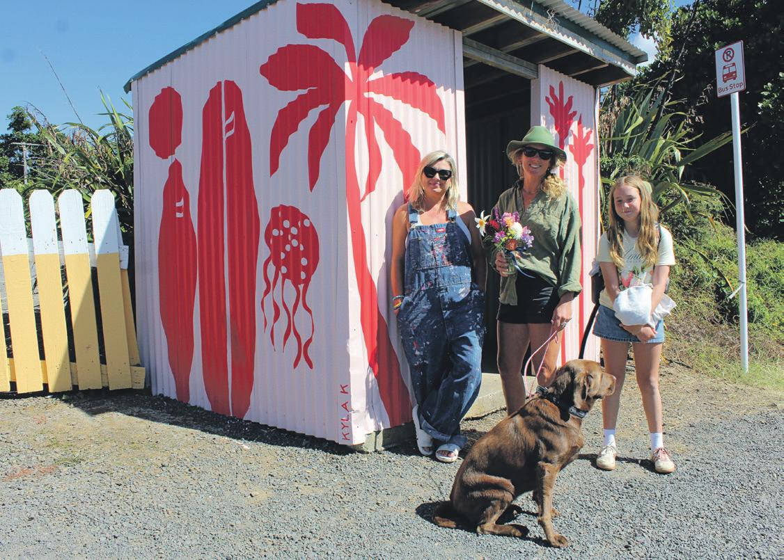 Kyla K, Kristel Lindfield and Frankie March at the recently refreshed bus stop on Wainui Rd.