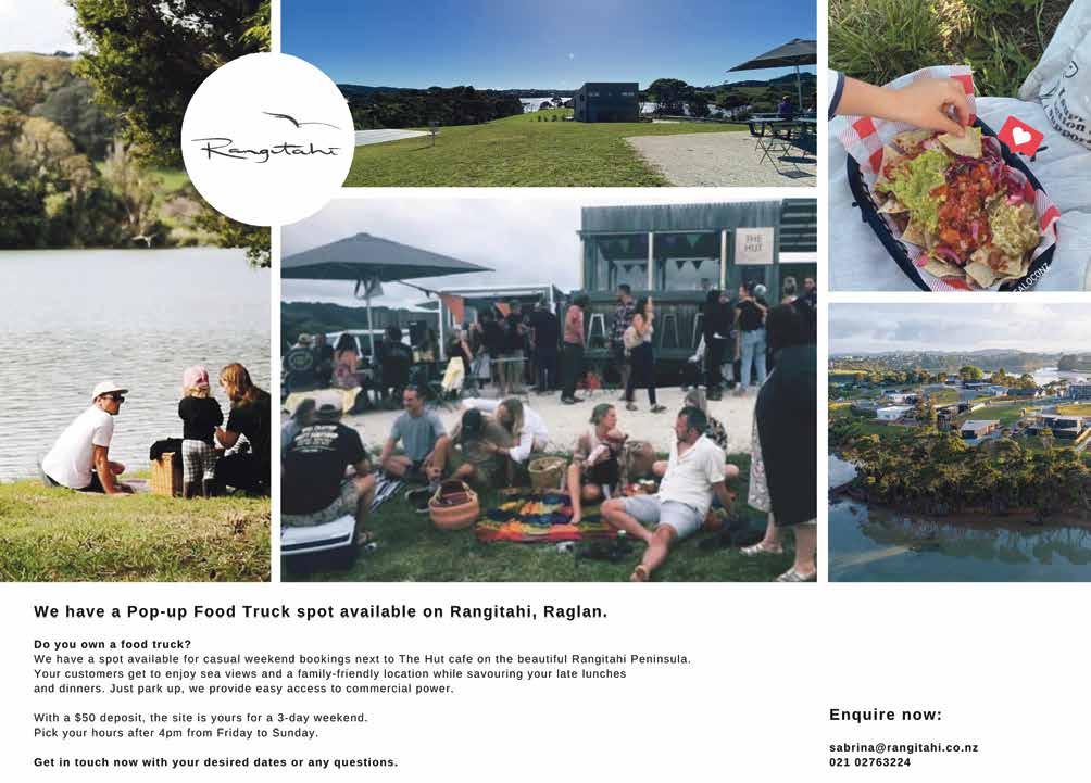 RAGLAN'S ORIGINAL SUSHI SHOP SINCE 2003 Open 6 days Wed - Mon until 4pm 07 825 7440 Serving honest local & good food Open 7 days 8am - 4pm Cnr Bow St & Wainui Rd 07 825 0027 Support our local eateries! Hours and specials below. 248 Wainui Rd | 07 825 8233 Open 7 Days a Week From 9am Open for Dinner Fri & Sat from 5:30pm Breakfast/Lunch 7 Days 43 Rose St 07 825 0010 Open 7 Days From 9:30AM Mon-Fri and 9AM Sat and Sun Waterfront dining indoor and outdoor seating Fish n’ Chips Group Bookings Inside/Outside Seating 92 Wallis St - 07 825 7544 Cream This space could be yours. Email the Chronicle for more details. info@raglanchronicle.co.nz E K Open 7 days a week from 10am 'til 7pm 92 Wallis St - The Wharf 07 825 7544 Open from 9am for breakfast & lunch 7 days. Dinner Fri & Sat 5.30 - 9pm with snacks menu from 3pm. 07 825 8233 248 Wainui Rd Phone orders welcome! *Fish & Chips* *Burgers* *Weekly Specials* The store with a lot more Open 9am - 7pm Wed - Sun Closed Mon - Tues Papahua Domain 07 825 8761 OUR LOCAL EATERIES Open Morning Noon and Night Treat yourself and call 07 825 0010 thewharfkitchenbar.co.nz 43 Rose St 07 825 0010 Open 7 Days Restaurant | Live Music | Bar 07 825 8010 harbourviewhotel.co.nz
