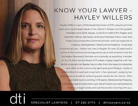 4 | Raglan Chronicle Magazine Issue May 2023 We’ll take a load off through times of grief. Talk to us today about Estate Administration and how we can help - will or no will. 0800 544 508 ginajansen.co.nz CALL US FOR A CHAT OR EMAIL admin@ginajansen.co.nz BUYING | SELLING | TENANCIES | TRUSTS | ESTATES | RELATIONSHIP PROPERTY DIVORCE | BUSINESS & COMMERCIAL | & SO MUCH MORE