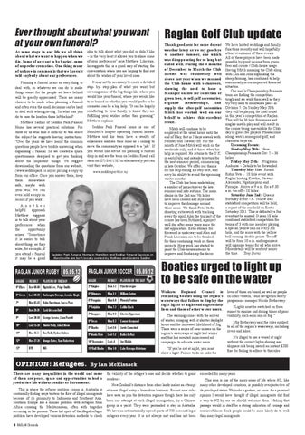 We have hosted weddings and family functions recently and will hopefully attract even more of these events. All of these projects have been made possible by good income from green fees and course / Clubhouse usage. Having Mitch manning the Club along with Ken and John organising the sheep farming, has combined to help %+#34#($/7&-+&#(3&-493#:%,&*+0+.-0/& situation. Our men’s Championship Pennants !%04&03%&*+,-+;&!"%&.#49%!-!-#+& tough and we wish them well as they try very hard to maintain a place in Division 5. On Sunday May 20th !"%7&)-//&2%&9/07-+;&!"%&*+0/&3#(+,& in this year’s competition at Raglan. This will be 36 hole foursomes and singles matchplay and will result in the course being unavailable for Club Mitch will continue to be day or green fee players. Please come employed at the usual hours until the end of May, that is 5 days a week with along, watch some good golf, and cheer our boys on. Monday and Tuesday off. For the Upcoming Events: month of June Mitch will work on the Sunday May 20th: Mens weekends only, and at times when his help is required. He returns to the U.K. Championship Pennants Div. 5 – 36 holes. in early July, and intends to return for Friday May 25th: Wrightson the next summer period, commencing Ambrose – Details to be forwarded. in late October. We offer our thanks Thursday May 31st: Round for his help during his stay here, and envy his ability to avoid the upcoming Robin Vets 18 hole event with Raglan hosting Kawhia, Stewart winter months. Alexander, Ngahinepouri and The Club has been undertaking Pirongia. Arrive at 9 a.m. for a 9.30 a number of projects over the late a.m. teeoff – 18 holes. summer and into autumn. The main Saturday June 2nd: Queens drains on the 2nd and 7th holes Birthday Event – A ‘Yellow Ball’ have been cleared and rejuvenated stableford competition will be held, to improve the drainage around a repeat of the one held on Easter those areas. We thank Peter Iti for A0!(3,07&BCDD5&E"-$&-$&,%*+-!%/7&0&'(+& donating extra work with trucking away the spoil. Also the top part of the event not be missed. It is an 18 hole combined stableford competition for course has been fertilised, a project teams of 3 with one member playing well due after some years since the a special yellow ball on every 3rd last application. Extra storage for hole, and the score with the yellow *3%)##,&-$&(+,%3)07&0+,&?/%@&0+,& ball earning double points. Tee off Frank Lorenzen are to be thanked will be from 10 a.m. and organisers for their continuing work on these will organise teams for all who arrive. projects. Now work has started to More details will be sent out nearer paint the Clubhouse interior to the time. Tony Burns improve and freshen up the decor.