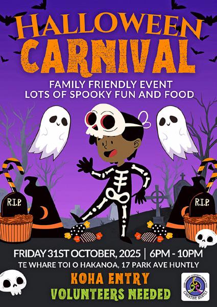 Entry is koha and guests are encouraged to come in costume. Volunteers are still needed and can contact manager.creative@ huntly.co.nz.