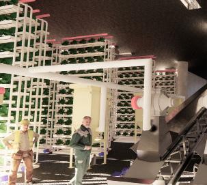 This simplified plan outlines the proposed rotating planters. Each tray accommodates 5-6 modified soya plants, optimizing yield in a vertical space measuring 16’5” in height and 9’ in length. There are 20 such trays in one farming unit, strategically aligned. Harvested produce is mechanically collected and transported through a Seed Vacuum Transport System for storage and future use..