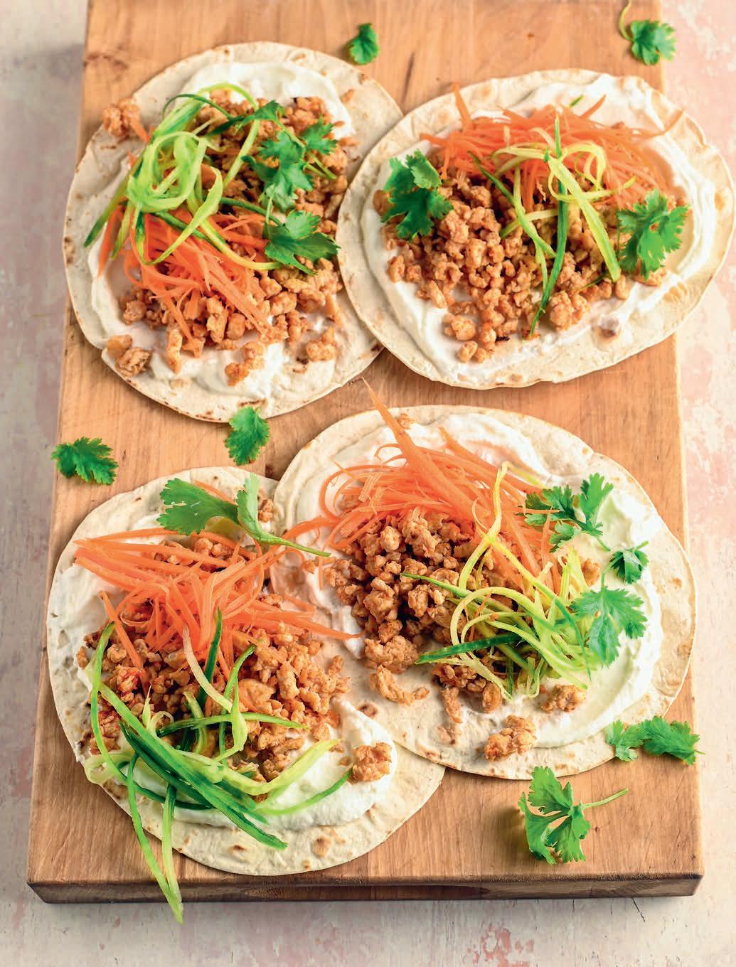 Kuumuta pannil õli, lisa karripasta ja sega kuumutades läbi. Lisa pannile kanahakkliha. Prae segades, samal ajal puust pannilabidaga suuremaid kanahakkliha tükke katki tehes, umbes 5 minutit. Maitsesta praadimise käigus soolaga. Määri lavaššidele Kreeka jogurtit. Jogurtile tõsta vürtsikas kanahakkliha. Tõsta peale riivitud kurki ja porgandit. Kõige peale saputa värskeid koriandri- või petersellilehti.