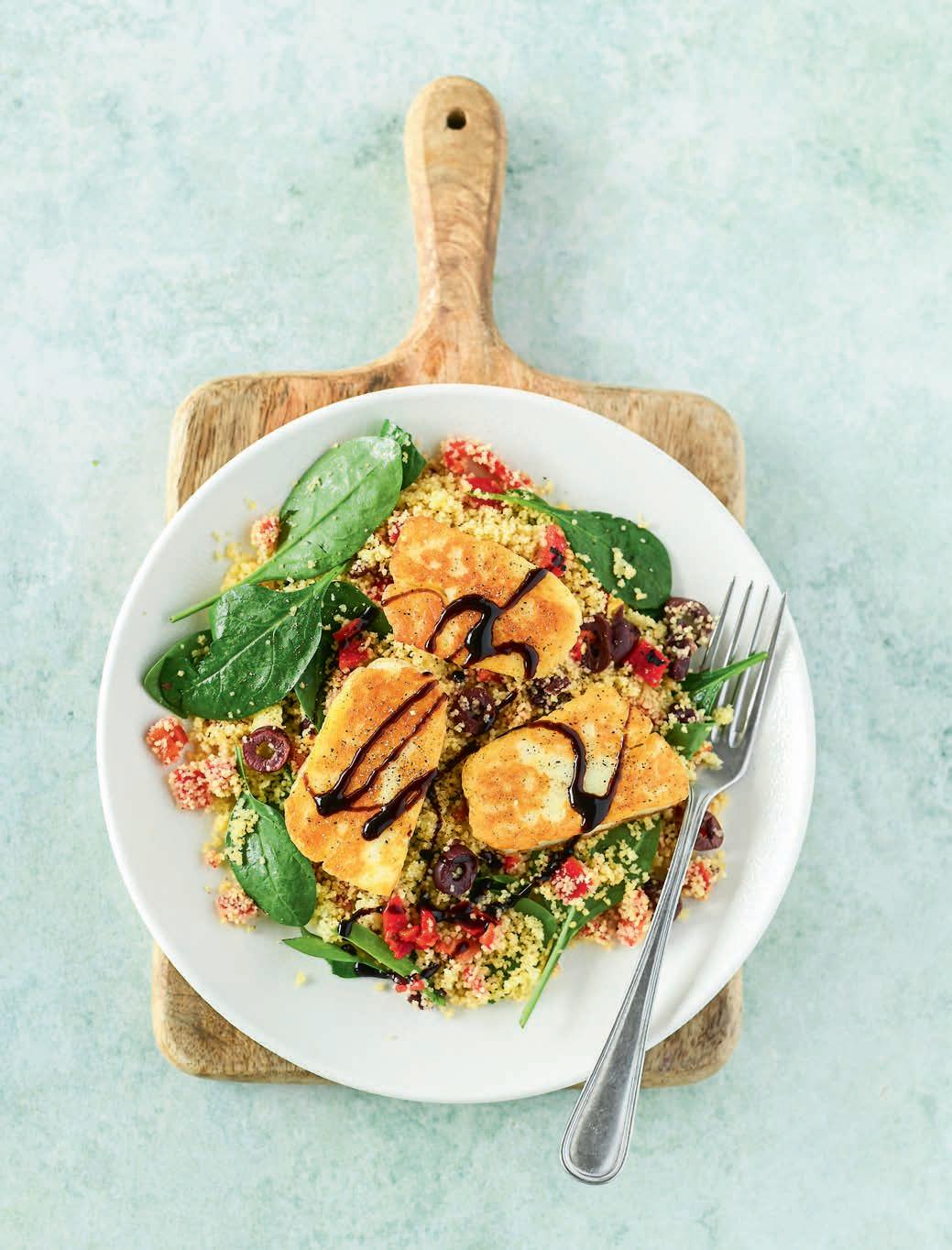 Vahemere-hõnguline salat valmib suures osas koostisainetest, mis võivad sul juba kapis olemas olla. Kuskuss, röstitud paprika konserv, oliivid, oliiviõli ja palsamiäädikakreem (balsamic cream) on just sellised toiduained. Juurde veel praejuustu, grilljuustu või halloumi t– kõik need sobivad.