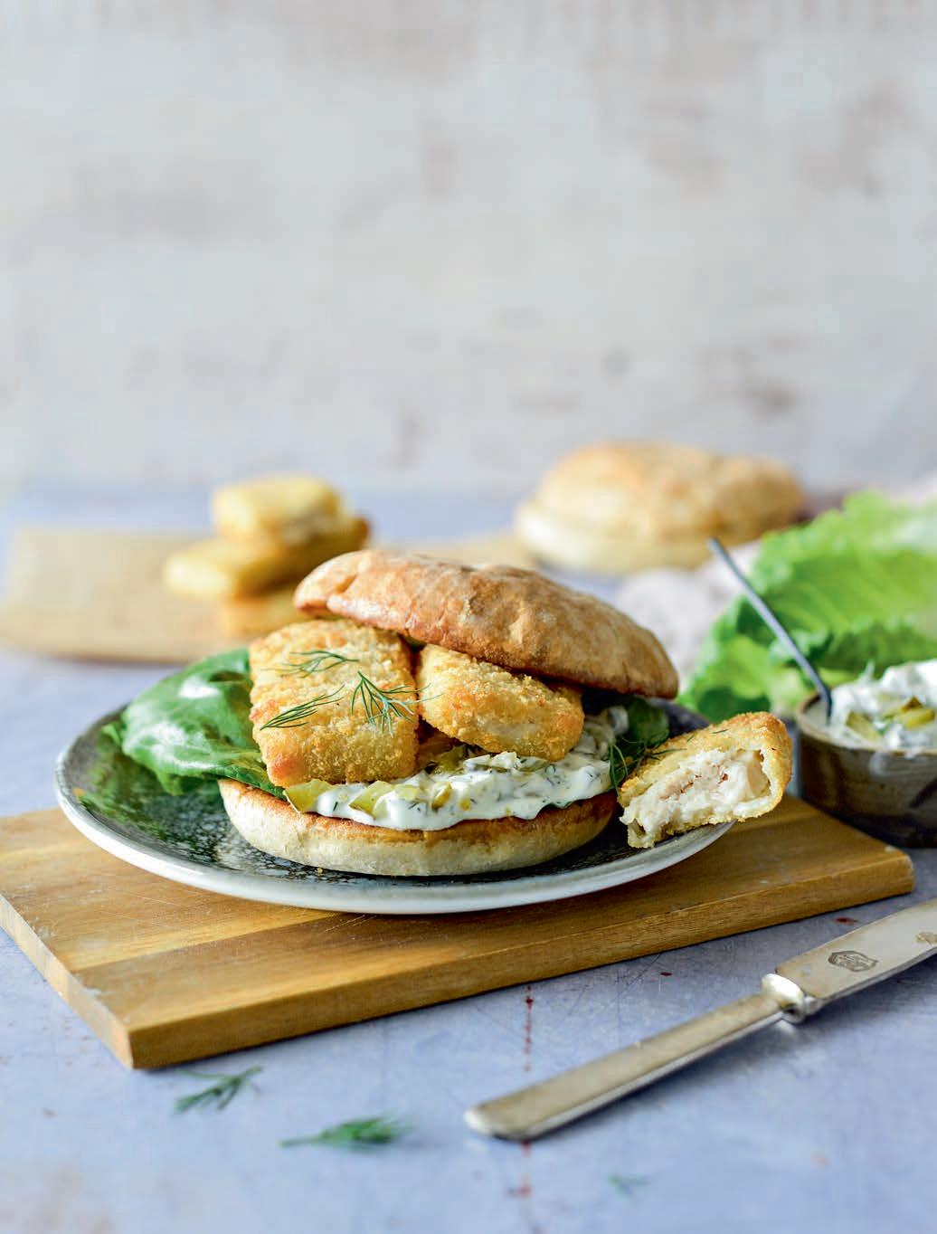 Ise tehtud kalaburks on nii hea! Eriti kui vahele pista kalafileest tehtud pulgad. Pildil oleva burgeri vahel on krõbedas pankopaneeringus kalafileepulgad, mis on laiemad ja neid mahub saia vahele kaks. Kui sul on saledamad kalapulgad, siis saad neid rohkemgi ritta laduda.