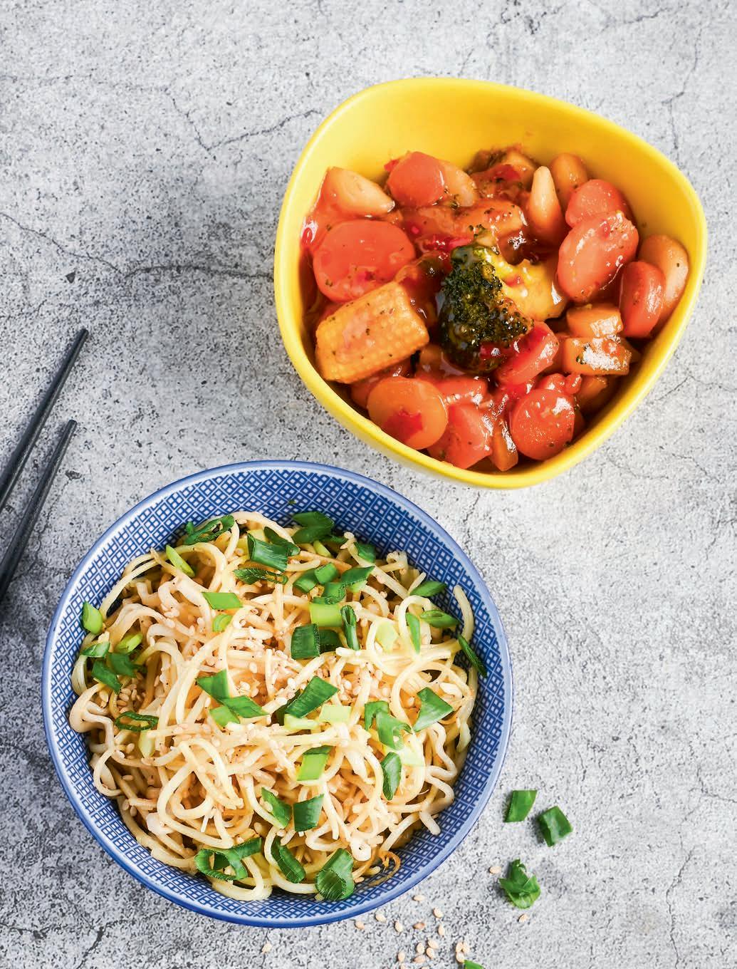 See kausitäis nuudleid on imelihtne, aga suurepäraselt toimiv maitsekooslus seesamist, ingverist ja värsketest sibulavartest. Sedamoodi valmistatud nuudlid sobivad täitsa omaette eineks, samas võid alati juurde praadida kanaliharibasid, krevette vms. Magusas tšillikastmes köögiviljad on koos seesaminuudlitega mõnus kombo.