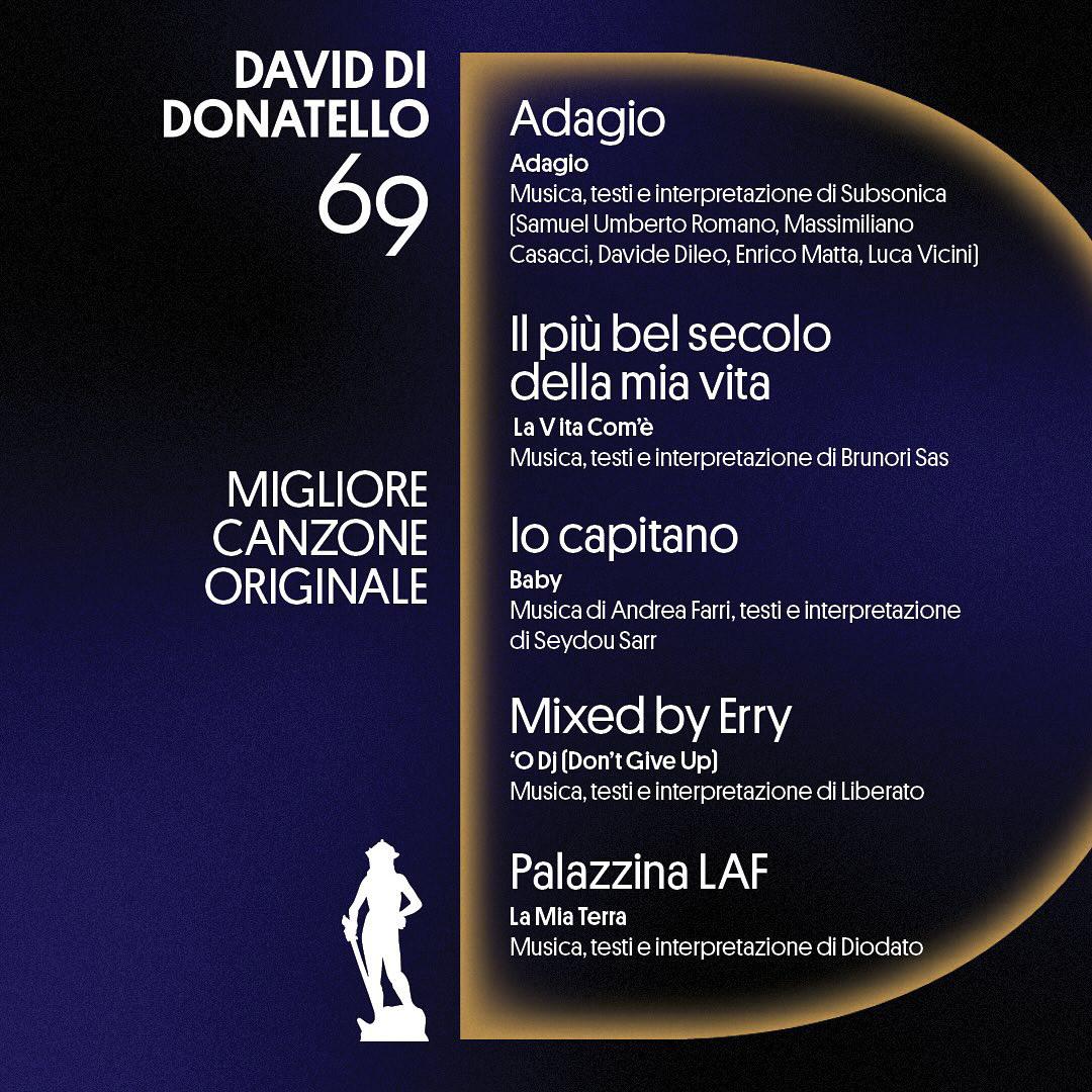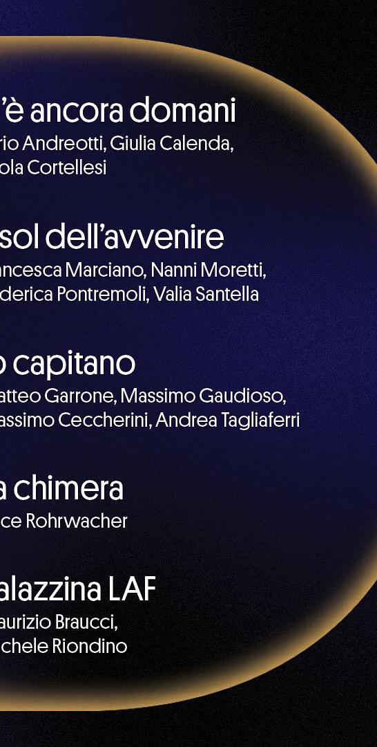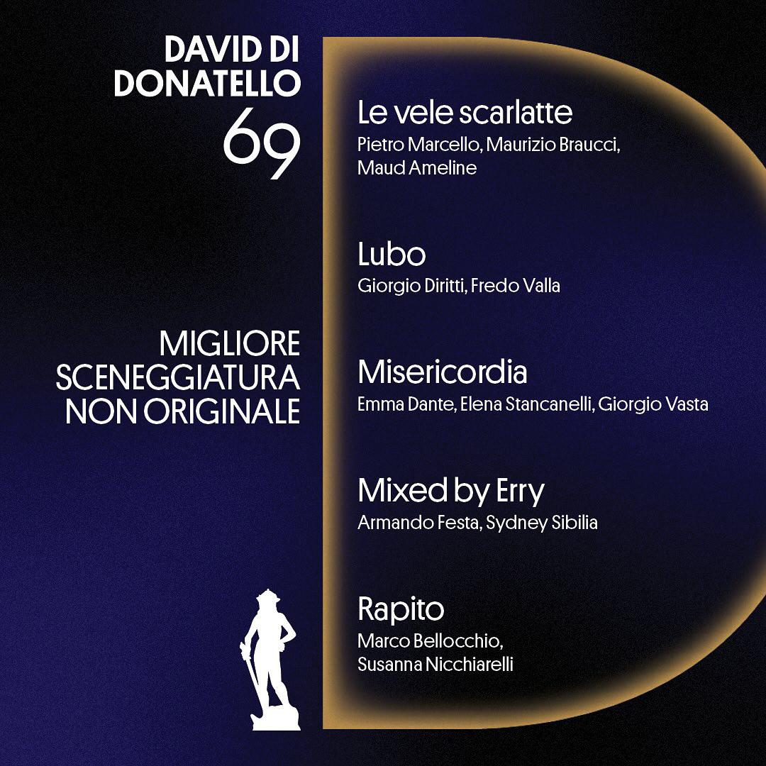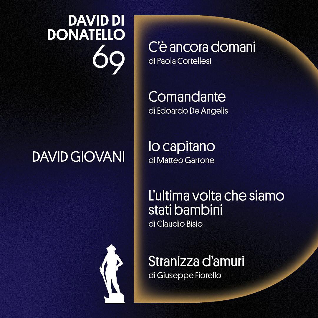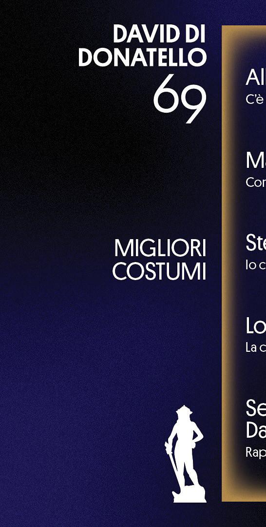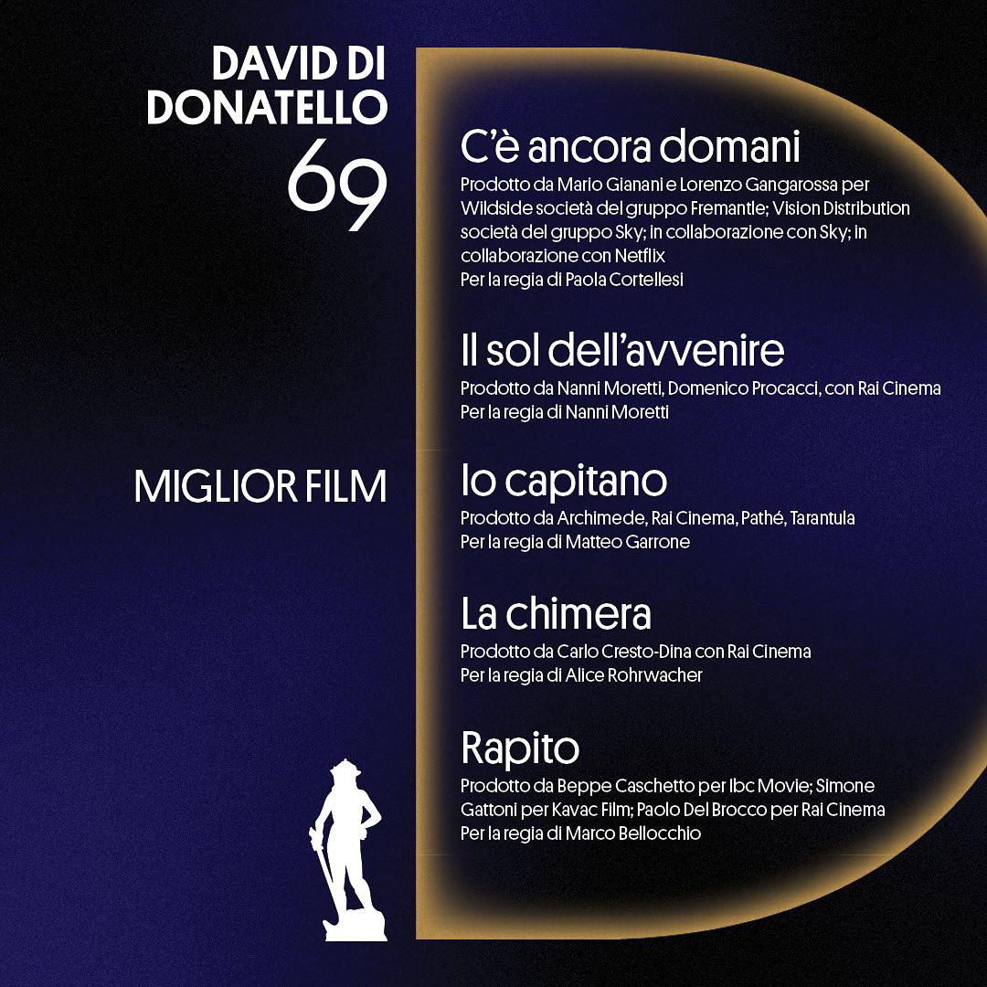 15 candidature, seguito da “La Chimera” di Alice Rohrwacher (13), “Rapito” di Marco Bellocchio (11), “Comandante” di Edoardo De Angelis (10) e “Il Sol dell'Avvenire” di Nanni Moretti (7). Un’edizione da record, la numero 69 dei Premi David Donatello: “Il primo record è che il David quest'anno è stato protagonista di “Call My Agent”, “Gloria” e oggi a teatro di una pièce con Silvio Orlando, questo significa che è diventato un brand in questi anni con l'aiuto di tutti” dice Piera Detassis, presidente e direttrice artistica dell'Accademia del Cinema Italiano – Premi David di Donatello, che prosegue: “Abbiamo lavorato molto con il Mic, con il consiglio direttivo e con la Rai proprio per riuscire a fare questo salto di qualità.