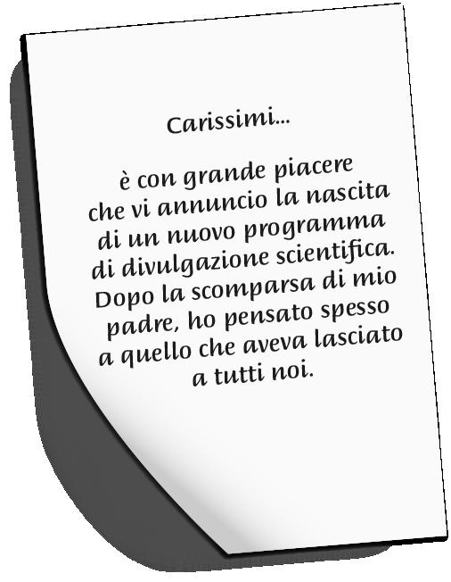 Ci sono almeno tre motivi che mi hanno spinto a realizzare questo progetto. Innanzitutto, perché non volevo che si interrompesse la rotta che Piero ha tracciato per così tanti anni, una visione che si basa sulla fondamentale intuizione di utilizzare la televisione, che è stata, ed ancora è per molti versi, uno dei mezzi di comunicazione più potente per spiegare la scienza e la cultura. In secondo luogo, perché la rete ammiraglia della televisione pubblica non può non avere un programma di divulgazione scientifica in prima serata. E infine, forse il motivo più importante. In tanti anni, sia mio padre sia io abbiamo incontrato quasi quotidianamente tante persone, da quelle comuni ad archeologi, ricercatori, ingegneri, medici, imprenditori, piloti e persino astronauti che ci hanno detto: “faccio questo mestiere perché da bambino vedevo i programmi di divulgazione di Piero”. Sono stati quei programmi a indicar loro la strada che poi hanno deciso di seguire. E spesso si tratta del mondo della ricerca o delle innovazioni, così cruciali per il nostro Paese e il nostro futuro.