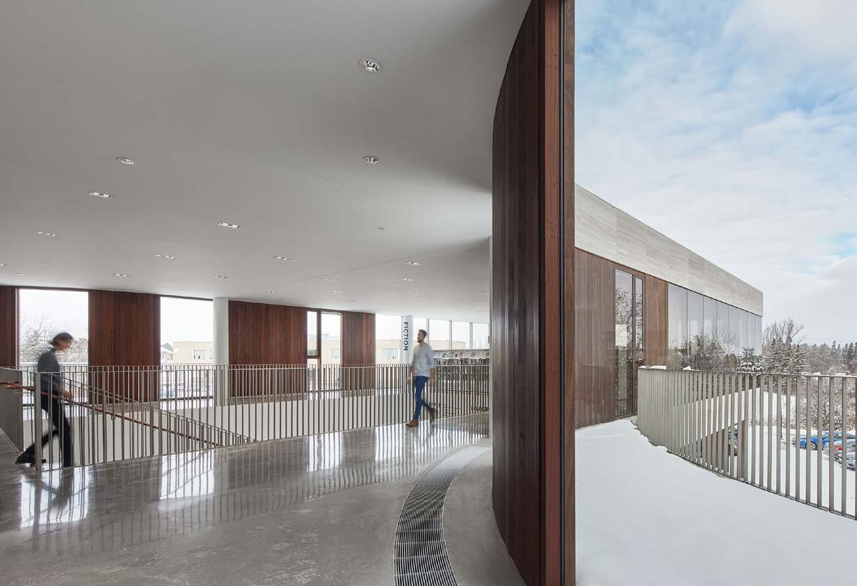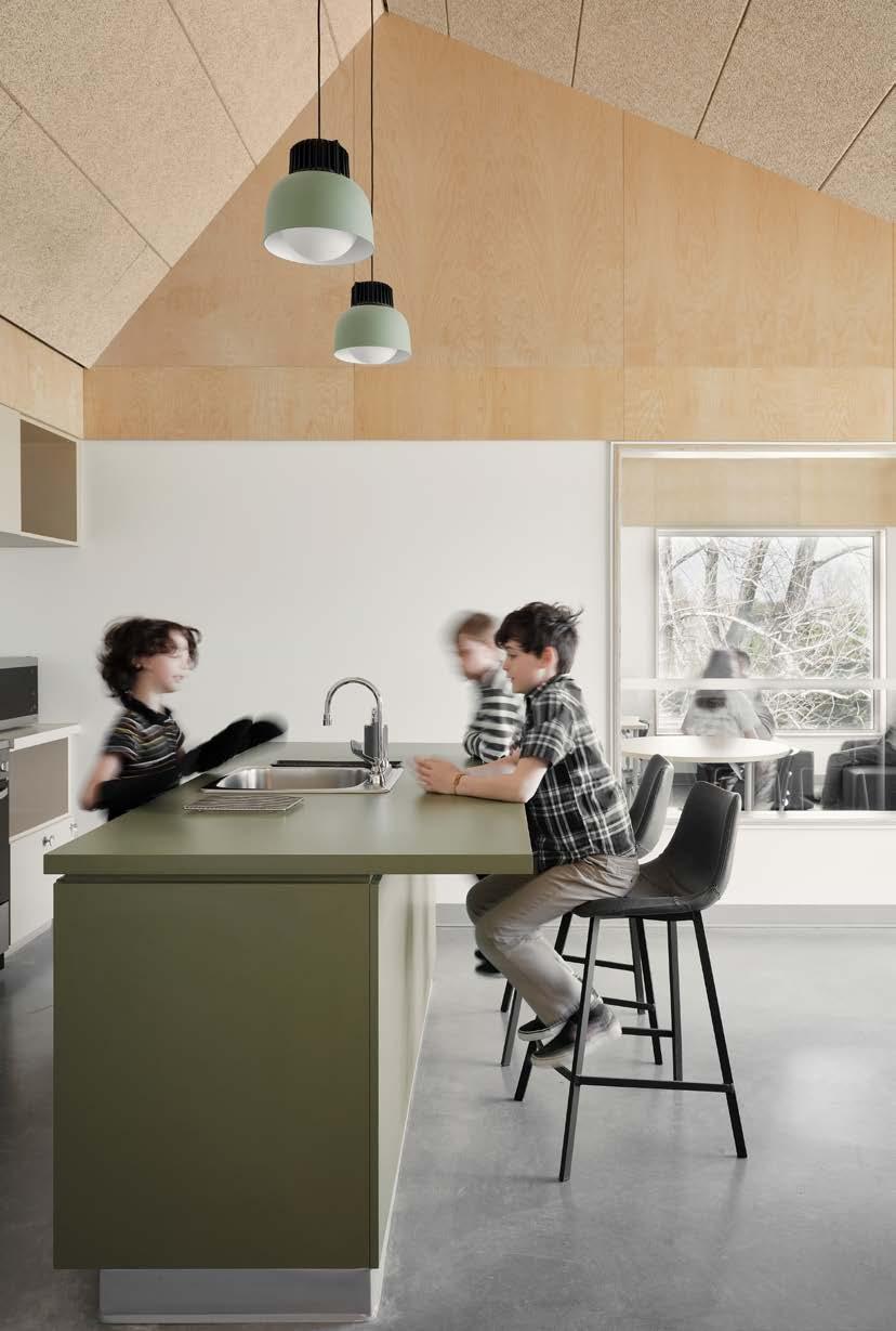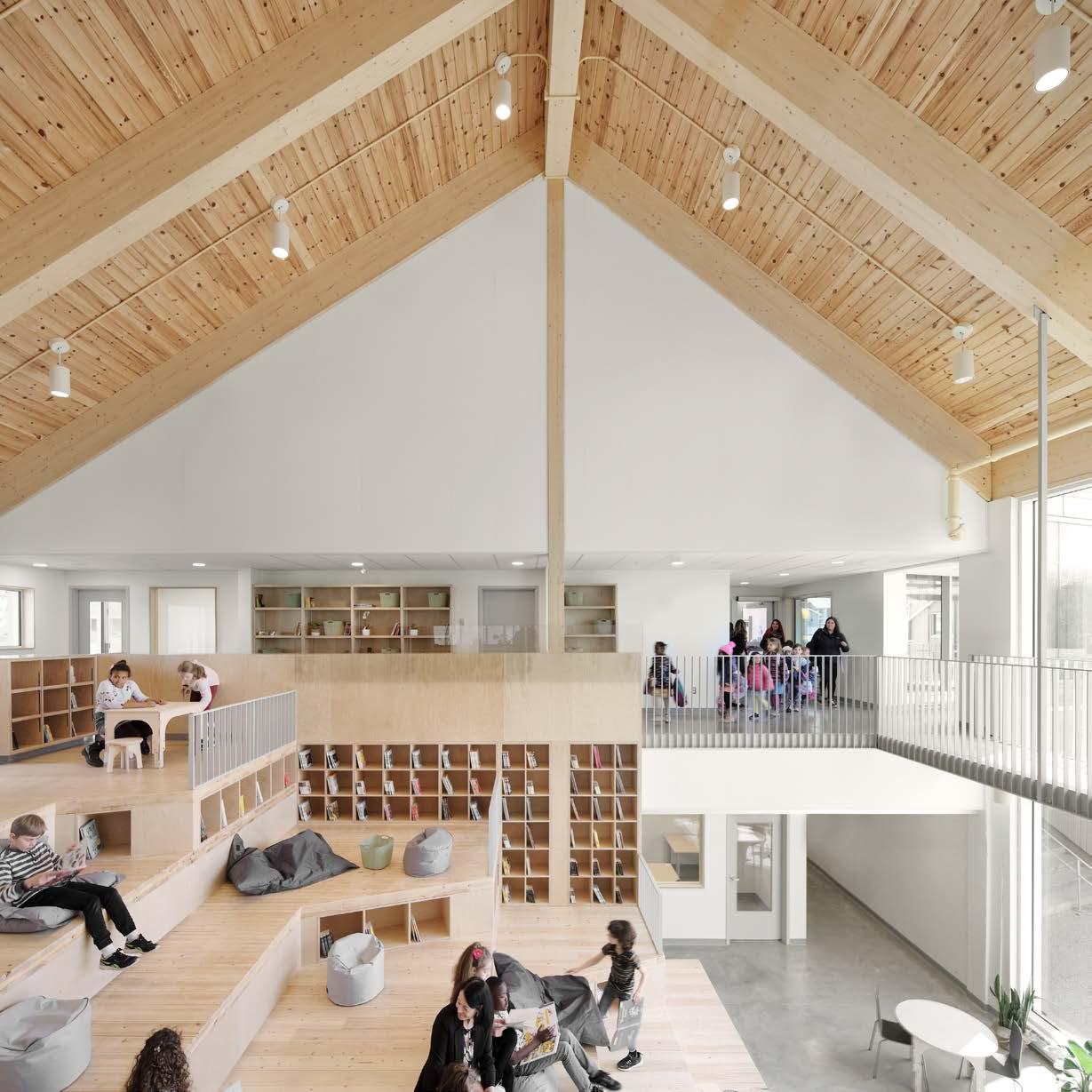 architecture and its capacity to adapt to people’s needs and improve social equity. In addition to being a gathering place, some projects demonstrated how architecture can enhance the way people interact and behave in them. The King City Public Library by Kongats Architects, for instance, provides a multi-generational community hub, matching the unexpected functions of a library and a seniors’ centre. The Jury appreciated the project’s capability to create inclusive and accessible spaces for its diverse users. The contextual response in the massing, scale and materiality was also a perfect fit for suburban King Township. The other project that impressed the Jury for its ability to mediate people and space was the École de l’Étincelle by Agence Spatiale, APPAREIL Architecture and BGLA. The school’s whimsical maisonette-like design breaks up the scale of the building complex, making it feel like a little village surrounding a central plaza. This serves as a stimulating activity courtyard that “sparks” the students’ curiosity and contributes to creating a safe space that fosters a sense of belonging.