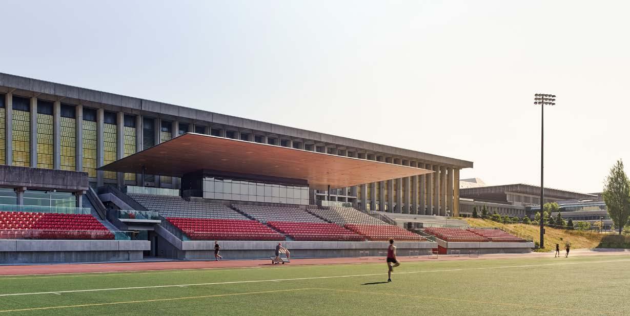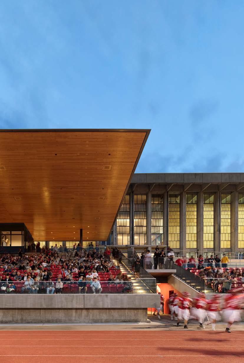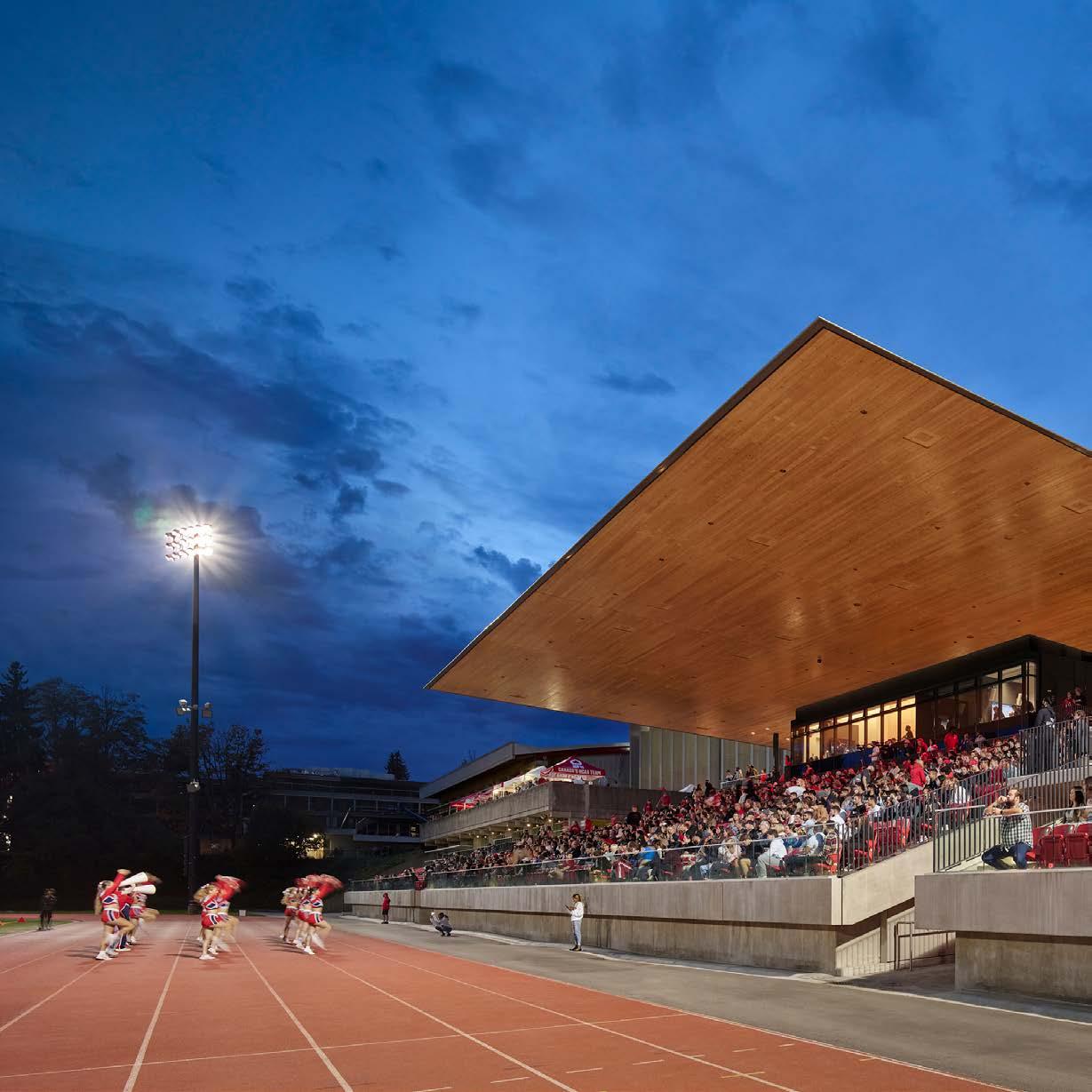 a new sheltered gathering and bleacher space to the aging stadium. The warmth of the wooden structure contrasts and tempers the cold, brutalist backdrop of the old Lorne Davies Complex Building.