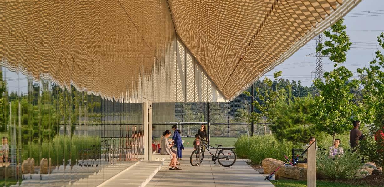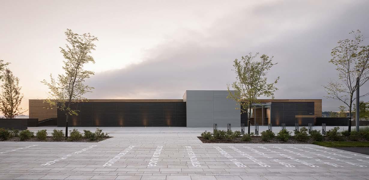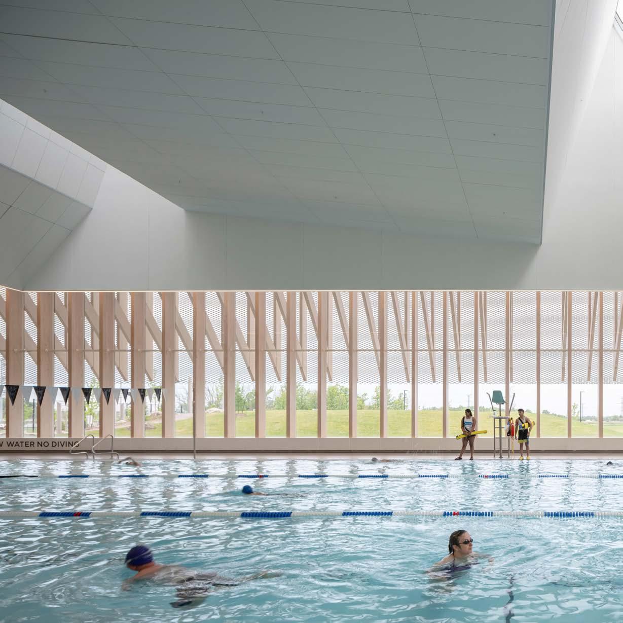 Le comité de sélection reconnaît l’importante valeur sociale de l’architecture ainsi que sa capacité à améliorer l’équité sociale et à s’adapter aux besoins de la collectivité, qui est composée de personnes de tous horizons. En plus de proposer des espaces de rassemblement, certains projets démontrent comment l’architecture peut améliorer les interactions et notre manière d’occuper les lieux. La Bibliothèque publique de King City, de Kongats Architects, en est un bon exemple : le bâtiment comprend un centre communautaire multigénérationnel combinant de façon surprenante des fonctions de bibliothèque et de centre pour personnes âgées. Le comité de sélection salue la capacité du projet à créer des espaces inclusifs et accessibles à une multitude d’utilisatrices et d’utilisateurs. Le bâtiment, par sa volumétrie, son échelle et sa matérialité, offre d’ailleurs une réponse contextuelle parfaitement adaptée à l’environnement de banlieue du canton de King. L’École de l’Étincelle, d’Agence Spatiale, d’APPAREIL Architecture et de BGLA, est un autre projet ayant impressionné le comité par sa capacité de réconcilier les gens et l’espace. L’aspect ludique de l’école et sa composition évoquant une série de maisonnettes réduisent l’échelle du bâtiment et lui donnent l’allure d’un petit village se déployant autour d’une place publique. Cette cour intérieure, où sont organisées des activités stimulantes éveillant la curiosité des jeunes, suscite un sentiment de sécurité et d’appartenance. Pour entretenir un mode de vie sain, il faut pouvoir pratiquer régulièrement des activités physiques. Les installations sportives et communautaires bien conçues favorisent la santé et le bienêtre, mais elles ont aussi un pouvoir rassembleur. C’est ce qui explique la sélection de trois établissements sportifs. Le Centre communautaire et le parc sportif de Churchill Meadows, signé par MJMA, propose une myriade d’espaces sportifs. Avec les espaces verts qui l’entourent et les locaux variés qu’il abrite, ce bâtiment à la toiture spectaculaire est adapté à la pratique de toutes les activités imaginables. De conception minimaliste,
