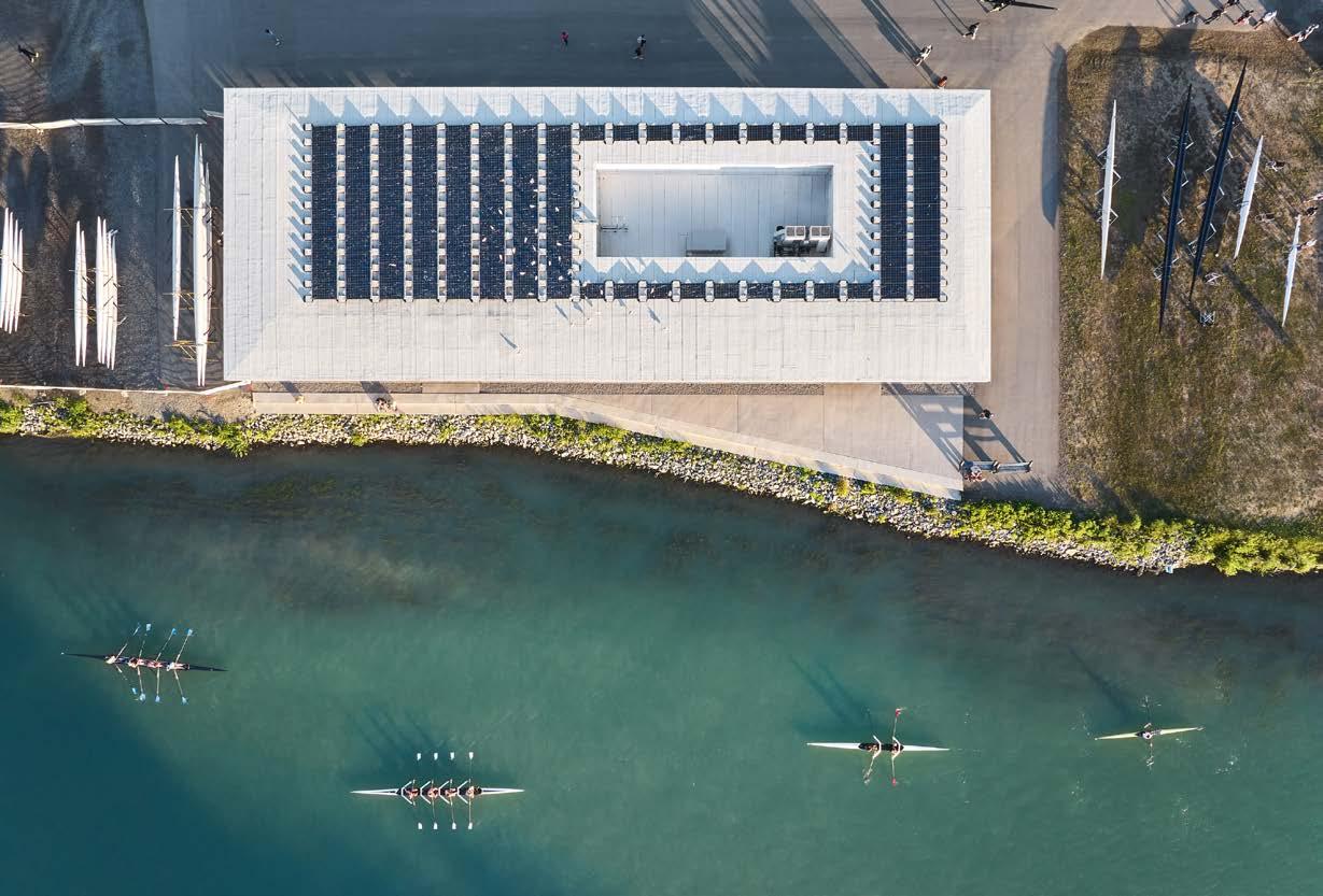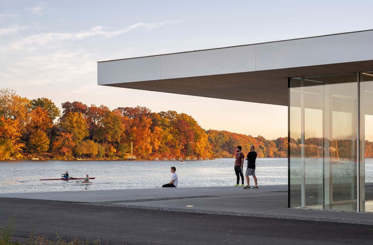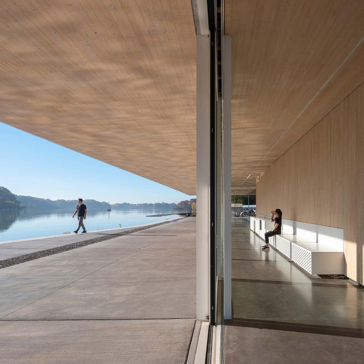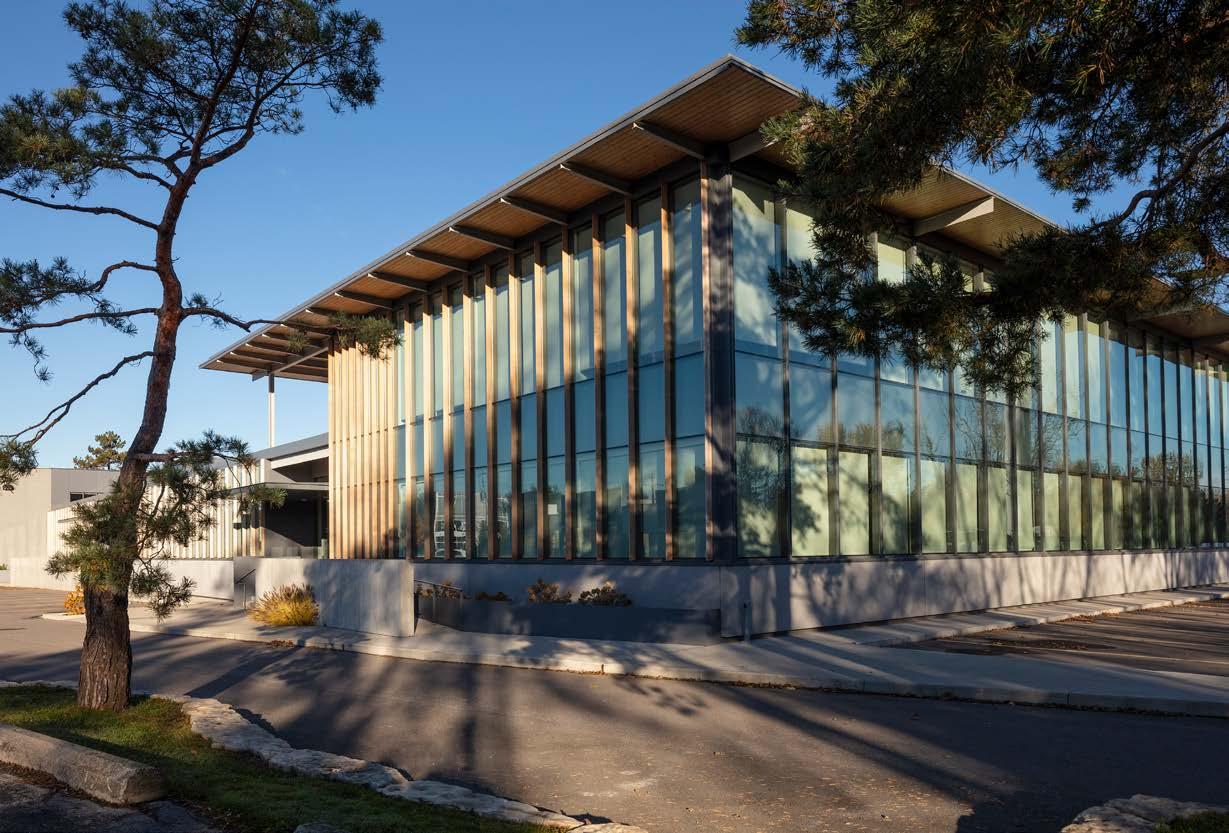 l’immeuble se distingue par la richesse de ses qualités spatiales mises en valeur par un jeu de lumière et de superpositions matérielles hors pair. À l’autre bout du spectre, le comité a sélectionné le Centre d’aviron Neil-Campbell, aussi de MJMA, et Raimondo + Associates Architects Inc., pour sa discrétion. L’immeuble de verre, dont la zénitude et la beauté intemporelle rappellent le style de Mies van der Rohe, se fond presque parfaitement dans la nature environnante. Le projet a hypnotisé le comité, qui salue la conception parfaitement adaptée à la méditation et aux entraînements en solitaire. Parallèlement, l’auvent en porte-à-faux qu’a conçu Perkins & Will pour le stade de la SFU éblouit à la fois par sa simplicité et par ses prouesses techniques. Cette intervention a offert à ce stade vieillissant des gradins et un nouveau lieu de rassemblement couverts. La structure de bois réchauffe et adoucit la facture froide et brutaliste du Complexe Lorne-Daviesen arrière-plan.