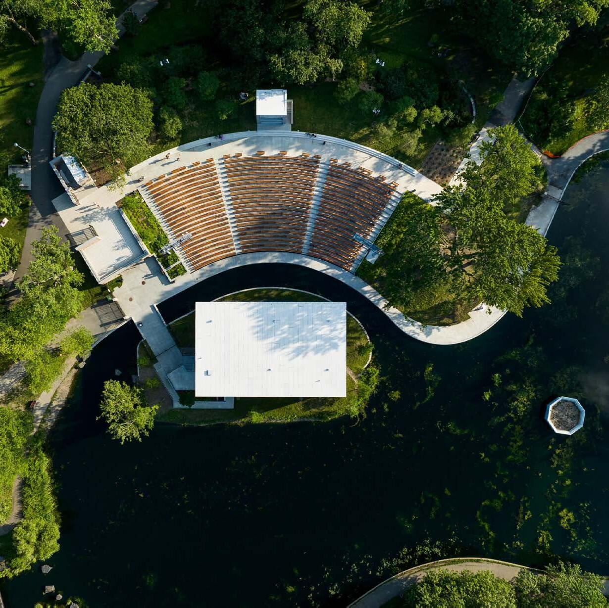 The redevelopment of Montreal’s Théâtre de Verdure has breathed new life into the La Fontaine Park and created a public amenity which is positively contributing to the urban landscape of the city once again. The building becomes a theatrical play in itself, with the observer becoming an active participant in the way one experiences the journey through the park, with glimpses of and through the building. The idyllic setting is enhanced by the theater being set on the water. This creates the illusion that the building is delicately floating, creating transparency and capturing views of nature beyond. The wellconsidered laying of materials and lightness of structure makes this project a delight to experience and a sensitive addition to the park.