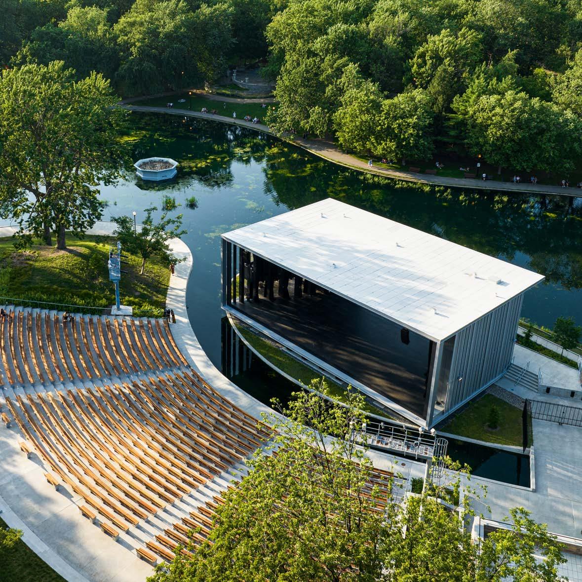 La vision de Lemay s’est articulée autour de la relation entre le paysage et le bâti, à travers un concept qui dématérialise l’architecture pour créer un dialogue constant entre la scène et son environnement. Chaque geste a été pensé dans une approche inclusive qui contribue à démocratiser la culture dans le respect de la mémoire et de la beauté du parc La Fontaine. L’arrivée des spectateurs – le premier acte – s’effectue à travers un sentier boisé longeant le plan d’eau, d’où émerge la structure scénique délicatement implantée sur l’île existante. Une végétalisation maximale a été réalisée dans le secteur pour améliorer l’effet d’écrin de verdure qui caractérisait initialement l’espace. À terme, la végétation reprendra ses droits sur l’île et viendra brouiller davantage les frontières entre architecture et nature.