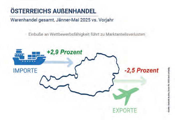 Österreichs Wirtschaft dar, wie Helmenstein am Beispiel der Industrie vorrechnet. Deren Entwicklung ist besorgniserregend. Ihr Anteil an der Bruttowertschöpfung nimmt trendmäßig ab. Helmensteins Urteil: „Wir stehen am Beginn einer De-Industrialisierung.“ Damit ginge nicht n ur industrielle Substanz verloren, sondern auch Innovationskraft und Exportstärke. Während von Jänner bis Mai 2025 die Importe nach Österreich um 2,9 % gestiegen sind, waren die Exporte um 2,5 % rückläufig. Die Daten zeigen klar die internationalen Marktanteilsverluste von österreichischen Unternehmen.