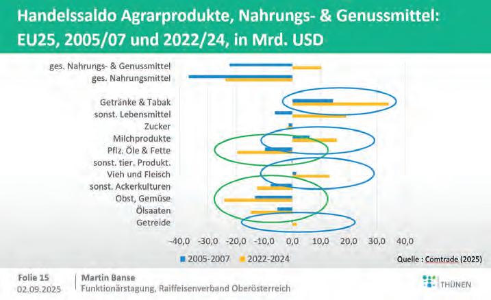 Ganz anders sieht es im Außenhandel aus: Die EU zählt weiterhin zu den größten Akteuren im globalen Agrar- und Lebensmittelaustausch. Beispielsweise erzielt sie bei Milchprodukten, Fleischwaren und Getränken hohe Handelsüberschüsse.