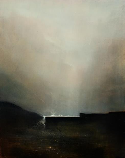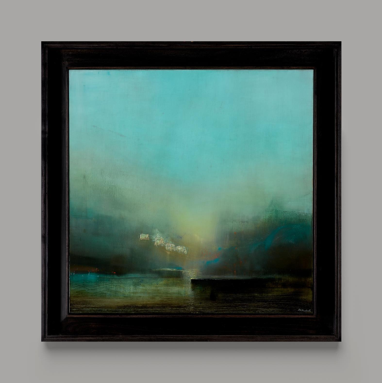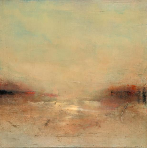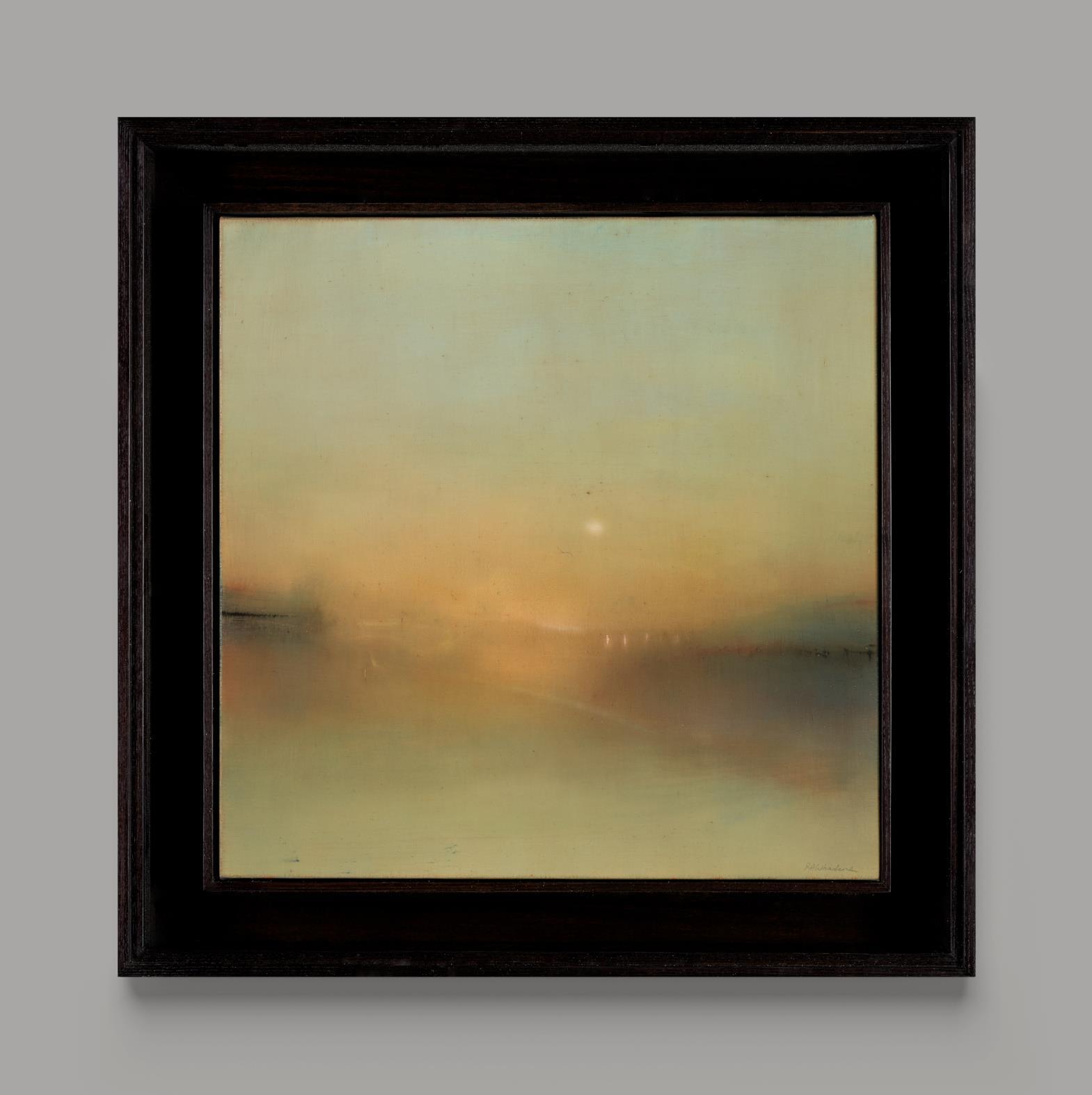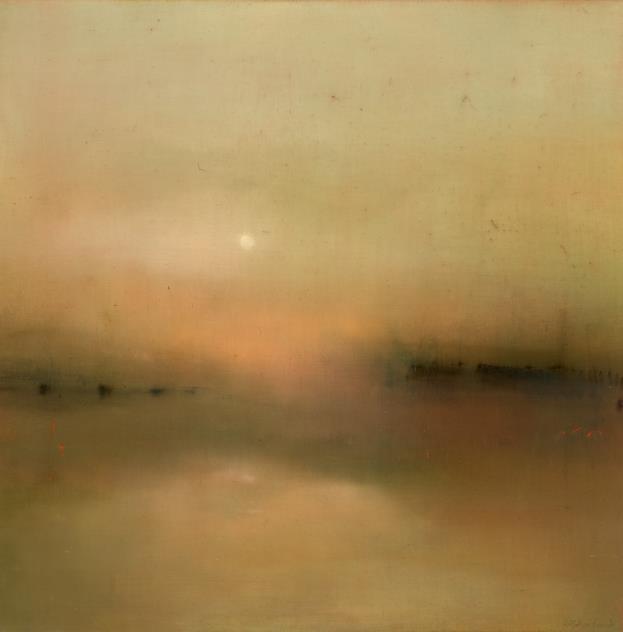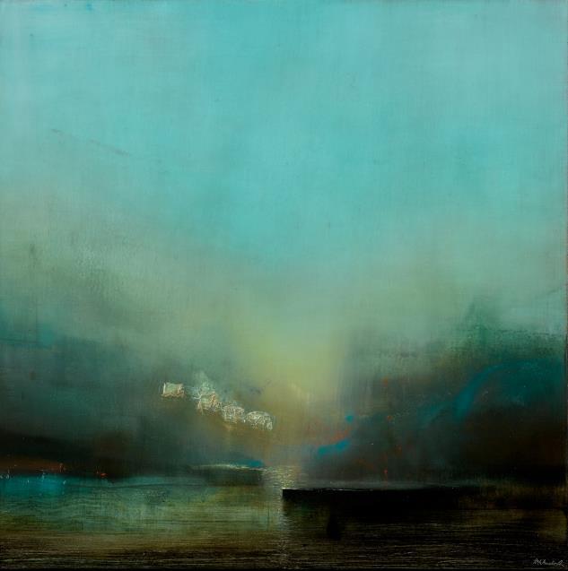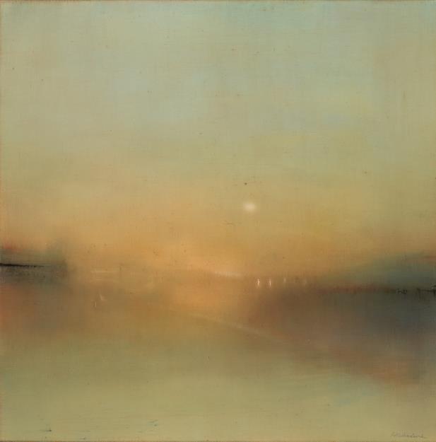 Through the meticulous layering of transparent oil glazes, Whadcock captures a sense of light refracted through weatheral prisms of mist, fog and water. The sublime Romanticism of the resulting images recall the late, unfinished works of J M W Turner but Whadcock’s world is less disturbed by the destructive forces of nature Instead we are invited to gaze, meditatively, into glowing fields of diffused colour that draw influence from another of Whadcock’s great inspirationsAbstract Expressionism. Peering through the gossamer of shimmering hues, shadowy forms emerge to suggest great masses of prehistoric rock but the fluidity of the paint softens our focus and reminds us that the natural landscape is anything but permanent Whadcock finds magic here in the falling light of dusk, the interval between day and night, when reflection meets anticipation and horizons evaporate into air.