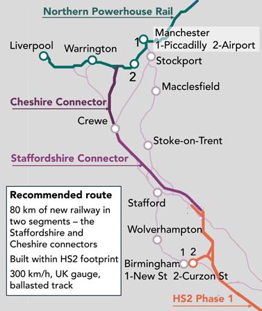 This call for increased private investment was echoed by a review led by David Higgins on behalf of the Mayors of West Midlands and Greater Manchester to enhance connectivity between their regions following the cancellation of HS2 phase 2. To do so, it highlighted the benefits of increased connectivity by comparing the GDP of Rhine/Rhur and Birmingham/Manchester/East Midlands regions. The report concludes that a new line is needed which should use the Parliamentary powers of the HS2 Phase 2a Act which expire in 2026.