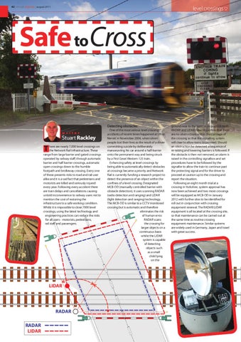 ground near to the barriers. In practice, both RADAR and LIDAR have to conďŹ rm that there are no obstructions within the curtilage of the crossing so that the signalling system will clear to allow trains to proceed. Should an obstruction be detected, a sequence of re-raising and lowering barriers is followed. If the obstacle is then not removed, an alarm is raised in the controlling signalbox and set procedures have to be followed by the signaller to allow the train to continue past the protecting signal and for the driver to proceed at caution up to the crossing and report the situation. Following an eight month trial at a crossing in Yorkshire, system approval has now been achieved and two more crossings will be equipped as MCB-OD in January 2012 with further sites to be identiďŹ ed for roll out in conjunction with crossing equipment renewal. The RADAR/LIDAR equipment is all located at the crossing site, so that maintenance can be carried out at the same time as routine crossing equipment maintenance. Similar systems are widely used in Germany, Japan and Israel with great success.
