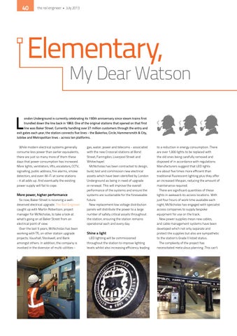 More power, higher performance So now, Baker Street is receiving a welldeserved electrical upgrade. The Rail Engineer caught up with Martin Robertson, project manager for McNicholas, to take a look at what’s going on at Baker Street from an electrical point of view. Over the last 5 years, McNicholas has been working with TfL on other station upgrade projects; Vauxhall, Stockwell, and Bank amongst others. In addition, the company is involved in the diversion of multi-utilities -
