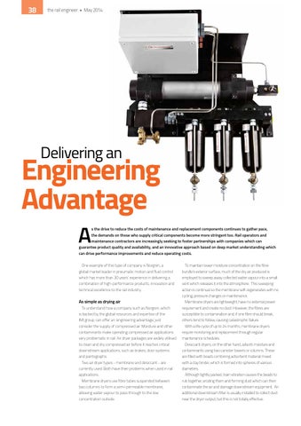 As simple as drying air To understand how a company such as Norgren, which is backed by the global resources and expertise of the IMI group, can offer an ‘engineering advantage’, just consider the supply of compressed air. Moisture and other contaminants make operating compressed air applications very problematic in rail. Air dryer packages are widely utilised to clean and dry compressed air before it reaches critical downstream applications, such as brakes, door systems and pantographs. Two air dryer types - membrane and desiccant - are currently used. Both have their problems when used in rail applications. Membrane dryers use fibre tubes suspended between two columns to form a semi-permeable membrane, allowing water vapour to pass through to the low concentration outside.