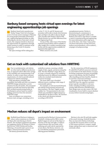 Get on track with customised rail solutions from HARTING Due to modularisation, rail vehicles are often built at different production sites, an approach which offers time savings in the assembly and commissioning of rail vehicles. In order to meet these customer requirements, it’s vital to provide tailored solutions for vehicle technology. With specialisms including cable assemblies, box builds and inter-car jumpers, HARTING design and produce custom solutions for the rail market. All customised products are built and tested at their fully IRIS-certified manufacturing facility in Northampton and are based on marketleading connectors from the extensive HARTING range. Inter-car jumpers run connections between train carriages, including roof or