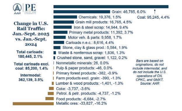 “Total carloads averaged 225,783 per week in September, more than the weekly average for the first nine months of the year (221,853). Year-to-date total carloads through September were up 2.1%, or more than 180,000 carloads, over the same period in 2024. In 2025 through September, 12 of the 20 carload categories the AAR tracks saw year-overyear gains.