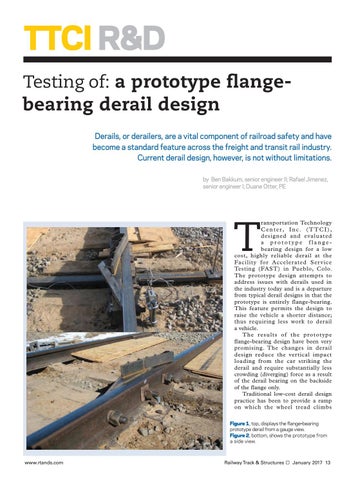 TTCI R&D Testing of: a prototype flangebearing derail design Derails, or derailers, are a vital component of railroad safety and have become a standard feature across the freight and transit rail industry. Current derail design, however, is not without limitations. by Ben Bakkum, senior engineer II; Rafael Jimenez, senior engineer I; Duane Otter, PE