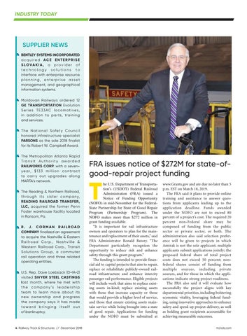 he U.S. Department of Transportation’s (USDOT) Federal Railroad Administration (FRA) issued a Notice of Funding Opportunity (NOFO) in mid-November for the FederalState Partnership for State of Good Repair Program (Partnership Program). The NOFO makes more than $272 million in grant funding available. “It is important for rail infrastructure owners and operators to plan for the maintenance and replacement of their assets,” said FRA Administrator Ronald Batory. “The Department particularly recognizes the opportunity to reduce risk and enhance safety through this grant program.” The funding is intended to provide financial aid to capital projects that aim to repair, replace or rehabilitate publicly-owned railroad infrastructure and enhance intercity passenger rail performance. Eligible projects will include work that aims to replace existing assets in-kind; replace existing assets with those that increase capacity or those that would provide a higher level of service, and those that ensure existing assets maintain service while being brought into a state of good repair. Applications for funding under the NOFO must be submitted at