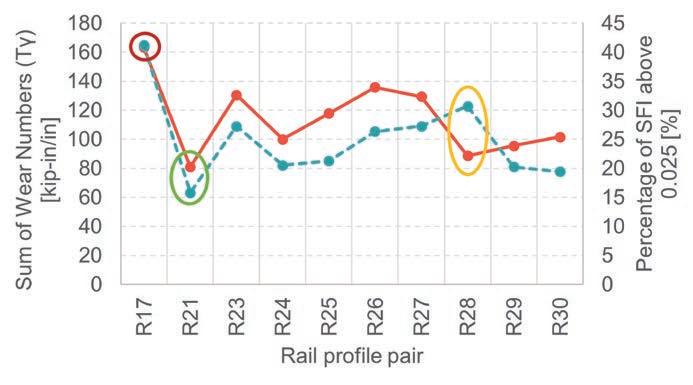 Figure 1 shows the sum of the wear numbers and the percentage of SFI values above 0.025 for each rail profile pair. The shapes of the wear number and the SFI plots generally conform to one another. The best- and worst-performing rail profiles are indicated by the green and red ellipses, respectively. The rail profile pair R28 (highlighted by the yellow ellipse) had the second worst RCF performance while simultaneously having the secondbest wear performance. The main causes of the best and worst performances of the rail templates were analyzed in more depth.