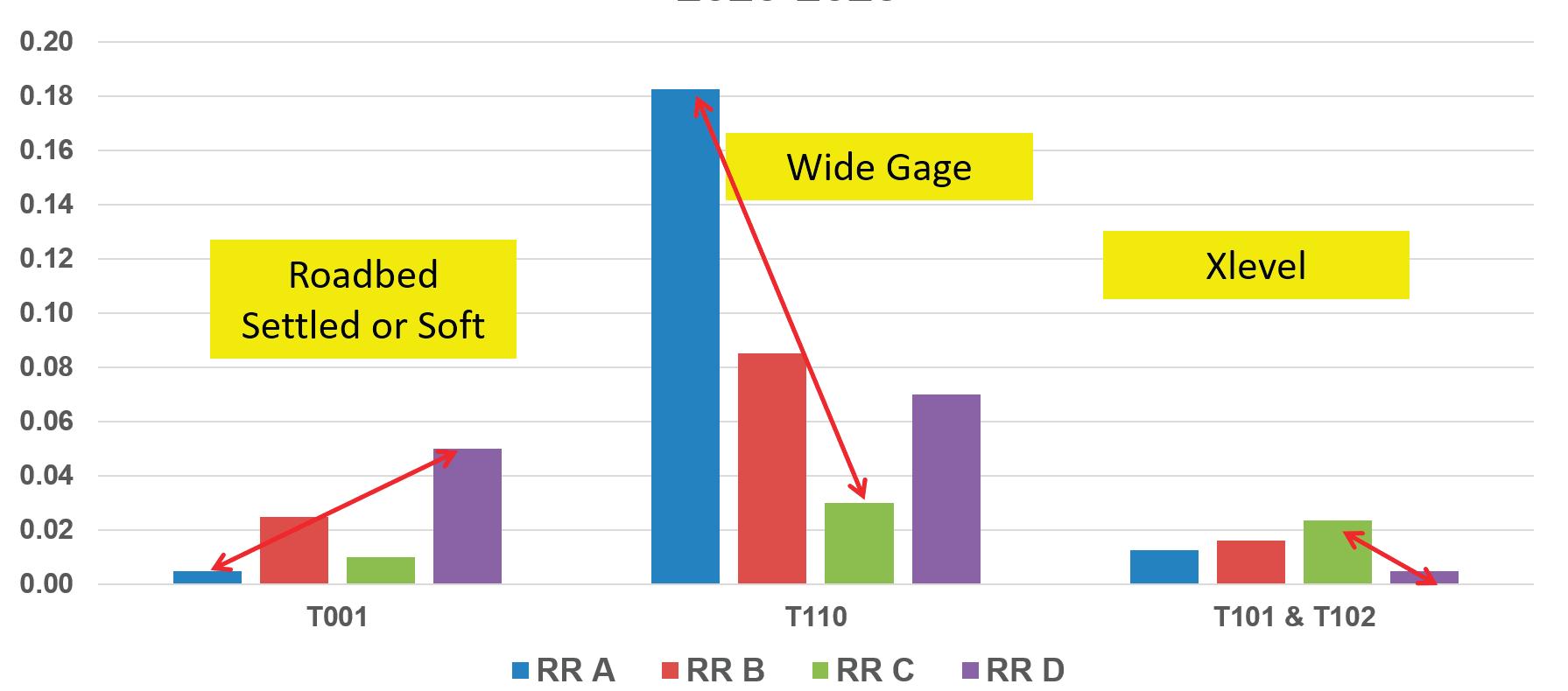 In general, except for the high rail crown radius of rail profile pair R17, the profile characteristic values increased as the RCF performance worsened. To achieve good RCF performance, the crown radius needs to be between 6 and 8 inches on the high rail and below 10 inches on the low rail. At the same time,