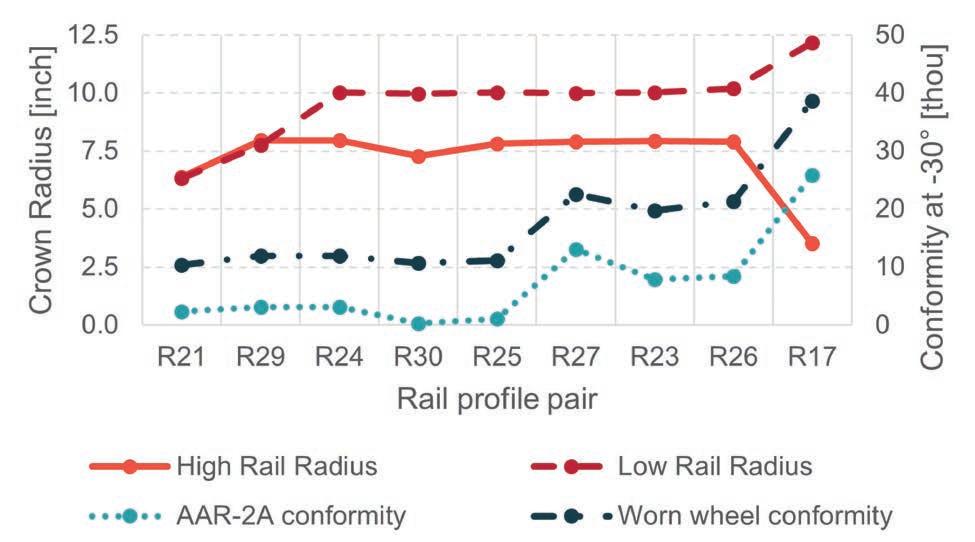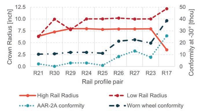 The rail profile pairs were sorted from best to worst, left to right, based on their RCF performance. (Rail profile pair R28 was excluded from this comparison.) The crown radii of the high and low rails are shown in Figure 3, which also shows the conformity of the high rail profiles to both the unworn AAR-2A and the worn wheel profiles.