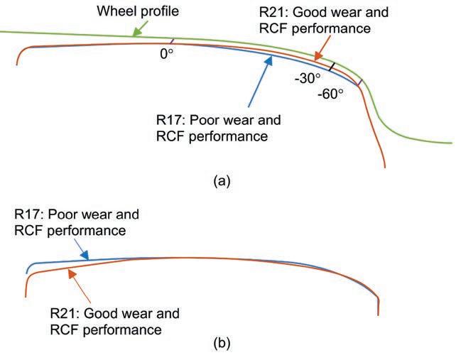 The performance of a given rail section is determined by the interaction between worn transverse wheel profiles and the transverse rail profile. Wear and rolling contact fatigue (RCF) performance are of particular interest to infrastructure owners because these factors can determine whether a rail needs to be replaced or maintained. Rail sections are manufactured and supplied with an as-rolled transverse rail profile. As the rail running surface wears, rail profiles may no longer provide adequate performance when contacting worn wheel profiles. Therefore, to improve performance throughout the rail’s service life, railroads develop and optimize rail profile templates that are applied by grinding. Persson et al.1 discusses an example of rail