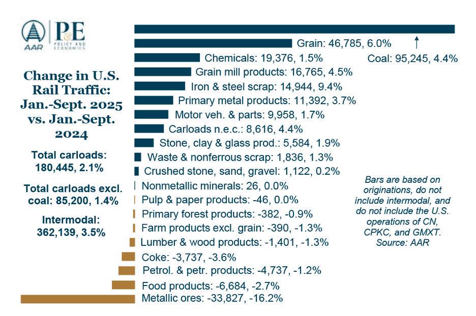 year-to-date as of September 30 is a mixed bag. According to the Association of American Railroads Policy & Economics unit, total U.S. carloads from Jan.Sept. 2025 are up by 2.1%, which equates to 180,455 carloads, over the same period in 2024. When coal is removed from the analysis, the carloads during the same period (Jan.-Sept. 2025 vs. Jan.-Sept 2024) were up 1.4%, which equates to 85,200 carloads. The AAR also reports that from Jan.-Sept. 2025, compared to the same period in 2024, intermodal volume (which includes containers and trailers) was up 3.5%, equating to 362,139 units.