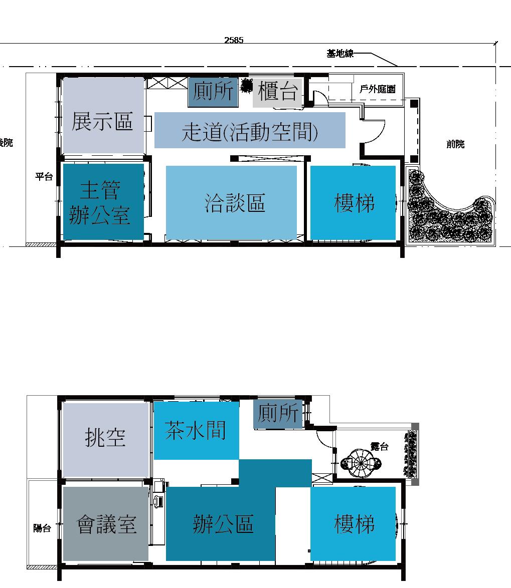 一層平面圖 基地線 2585 890 平台 戶外庭園 前院 後院 微波爐 A C B C’ B’ A’ 二層平面圖 露台 陽台 微波爐 A C B C’ B’ A’