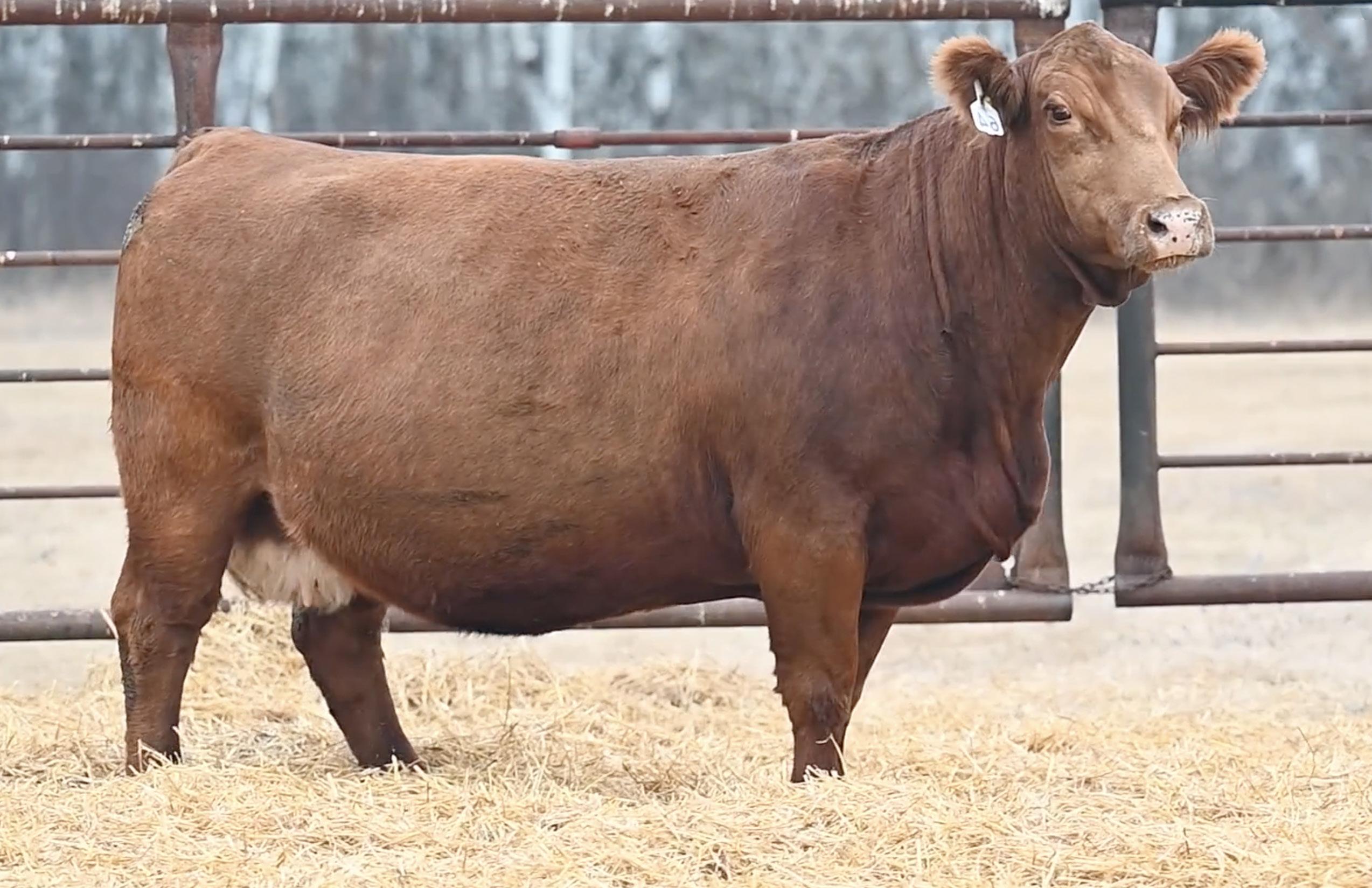 We featured 90M’s dam and flush sister in last year’s sale, with her sister selling to Section 17 Livestock, SK. Her dam is a beautiful young donor cow that combines some of the most sought after traits in today’s industry. Dark cherry red and a baldy face with an elegant, feminine design and impeccable, show quality udder. 84H throws more calving ease than her EPDs suggest. She has a dark cherry red, blaze face Preacher bull in the pen this year that is going to be a popular calving ease option in our upcoming bull sale. Similarly, I expect 90M to be a female that could offer some calving ease and handle being bred to some power. 90M looks like a very typical Walk The Line daughter. She is feminine in her design and very free in her movement. She is darker red in colour and nicely extended through her front third with plenty of capacity. Her EPD profile has a lot of green in it, with strong numbers across the chart. Being bred to the outcross black bull we purchased for $52,500 this spring will make for a quick ROI. MRL 4450M is hetero black so the calf could still come red, but the calf’s more outcross pedigree and strong EPD profile will make it marketable regardless of colour.