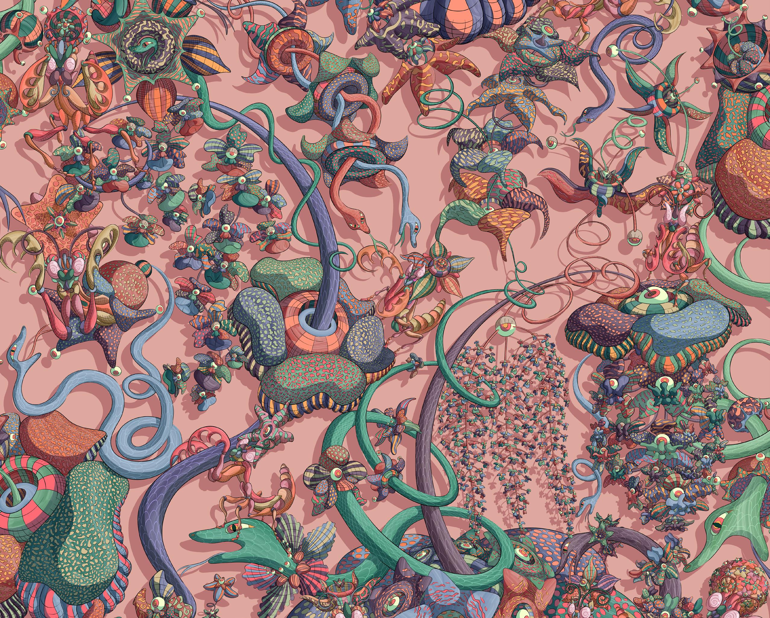 SAM WILDE: I tend to start analogue, with sketches, watercolour, gouache and mad labyrinthine repeat maps. Then I’ll translate that work into the digital realm, while trying my best to maintain the hand drawn lucidity from those earlier stages. However, the most important part of the process is transforming digital into material. As this is how the viewer will experience and hopefully fall in love with the work. Whether that’s as a printed textile, wallpaper, moving-image installation or whatever else.