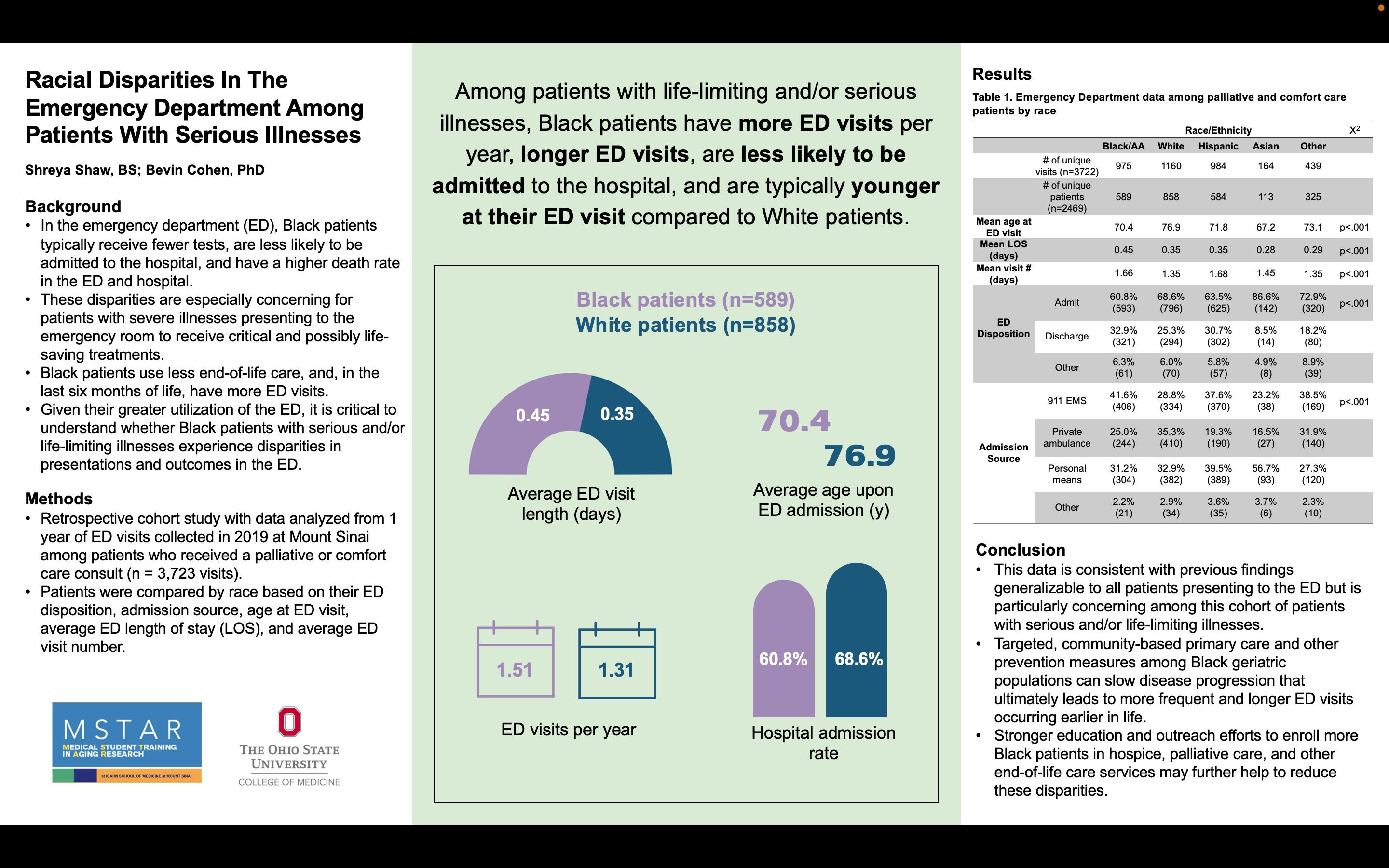 Conclusion: This data is consistent with previous findings generalizable to all patients presenting to the ED but is particularly concerning among this cohort of patients with serious and/or life-limiting illnesses. Targeted, community-based primary care and other prevention measures among Black geriatric populations can slow disease progression that ultimately leads to more frequent and longer ED visits occurring earlier in life. Moreover, stronger education and outreach efforts to enroll more Black patients in hospice, palliative care, and other end-of-life care services may further help to reduce these disparities.
