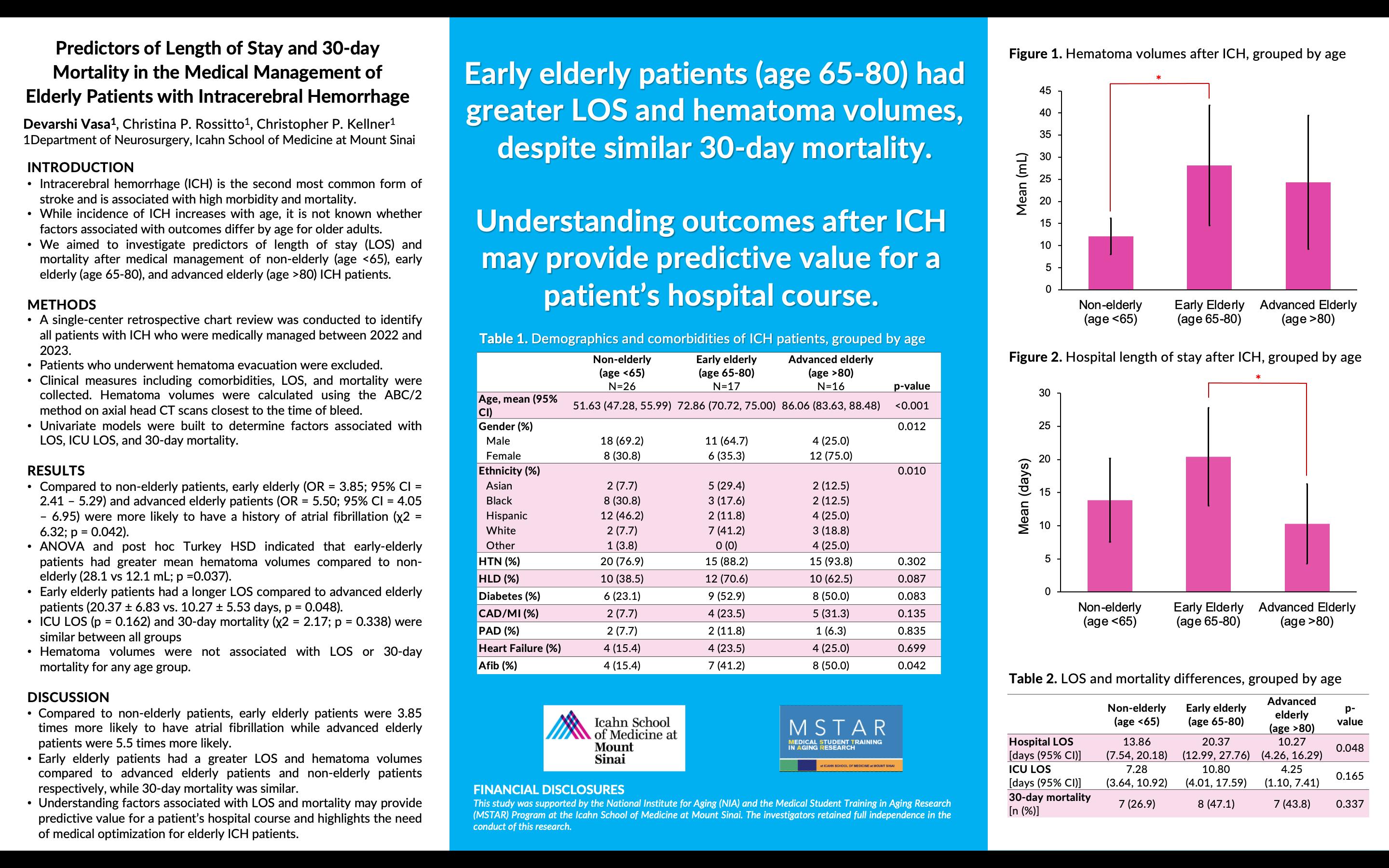 Conclusion: Early elderly patients had a greater LOS and greater hematoma volumes compared to advanced elderly patients and non-elderly patients respectively, while ICU LOS and 30-day mortality were similar. Understanding factors associated with LOS and mortality may provide predictive value for a patient’s hospital course and highlights the importance of medical optimization for elderly ICH patients.