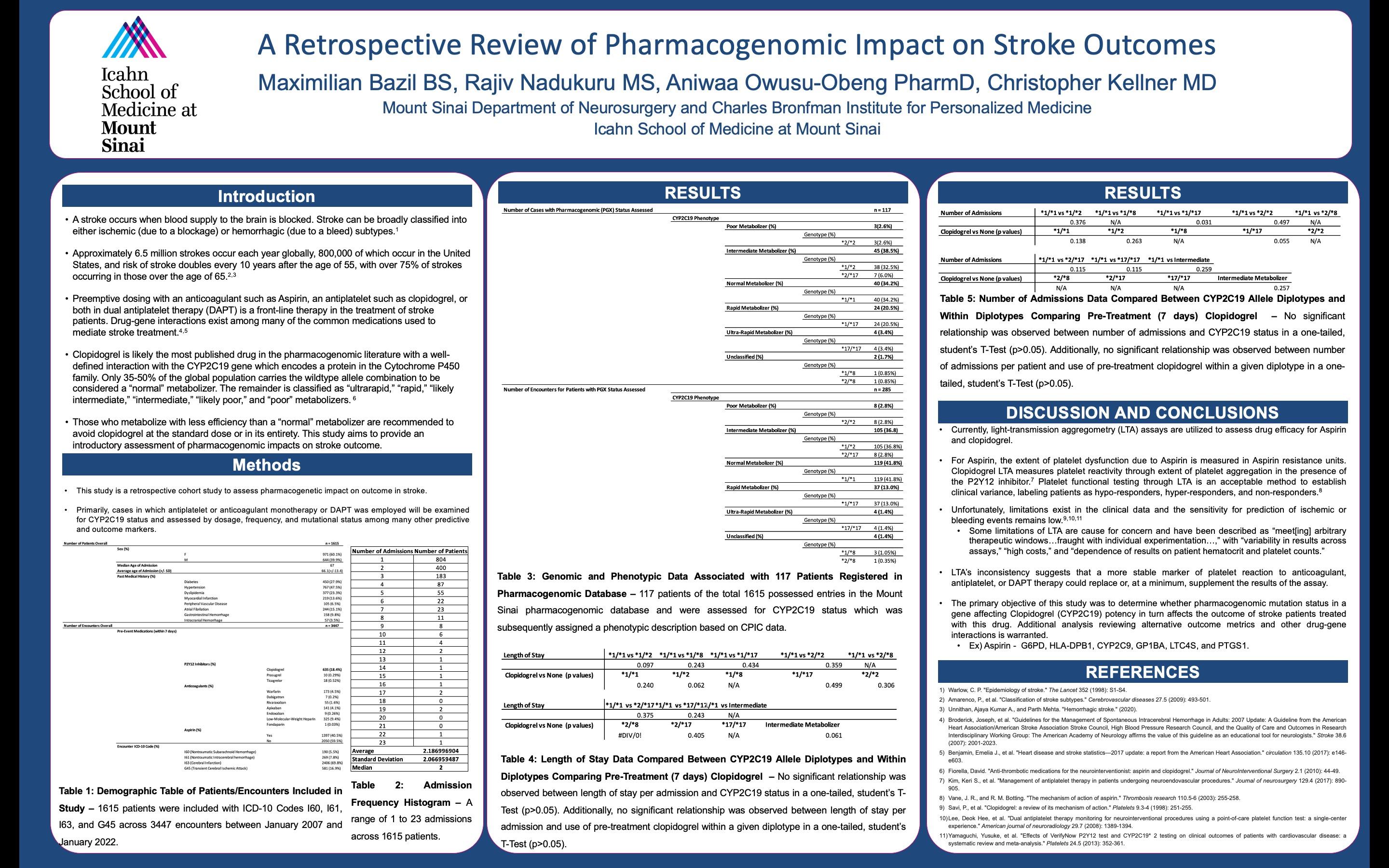 Introduction: A stroke occurs when blood supply to the brain is blocked. Stroke can be broadly classified into either ischemic (due to a blockage) or hemorrhagic (due to a bleed) subtypes.1 Approximately 6.5 million strokes occur each year globally, 800,000 of which occur in the United States, and risk of stroke doubles every 10 years after the age of 55, with over 75% of strokes occurring in those over the age of 65.5,6 Preemptive dosing with an anticoagulant such as Aspirin, an antiplatelet such as clopidogrel, or both in dual antiplatelet therapy (DAPT) is a front-line therapy in the treatment of stroke patients. Drug-gene interactions exist among many of the common medications used to mediate stroke treatment. Clopidogrel is likely the most published drug in the pharmacogenomic literature with a well-defined interaction with the CYP2C19 gene which encodes a protein in the Cytochrome P450 family. Only 35-50% of the global population carries the wildtype allele combination to be considered a “normal” metabolizer. The remainder is classified into groups such as “ultrarapid,” “rapid,” “likely intermediate,” “intermediate,” “likely poor,” and “poor” metabolizers. Those who metabolize with less efficiency than a “normal” metabolizer are recommended to avoid clopidogrel at the standard dose or in its entirety. This study aims to provide an introductory assessment of pharmacogenomic impacts on stroke outcome.