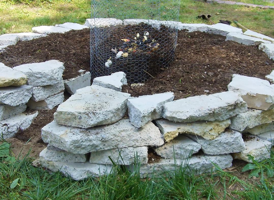 After completing the rock work, it was time to create the compost basket and fill the bed. For this garden, I formed hardware cloth into a one-foot diameter column and placed it in the center near the narrow part of the pie-shaped wedge. To prevent the soil from spilling into it, I wrapped it in newspaper, which would eventually break down.